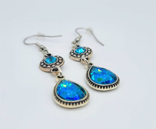 Antiqued Silver Teal Blue Rhinestone Teardrop Earrings