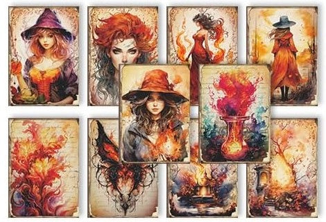 Fiery Red Witches-Set of 10 4" x 6" Decoupage Wood Panels