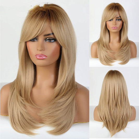 Wig - Medium Long Hair with Platinum Highlights - Brown Gradient Dyed Chemical Fiber Hair