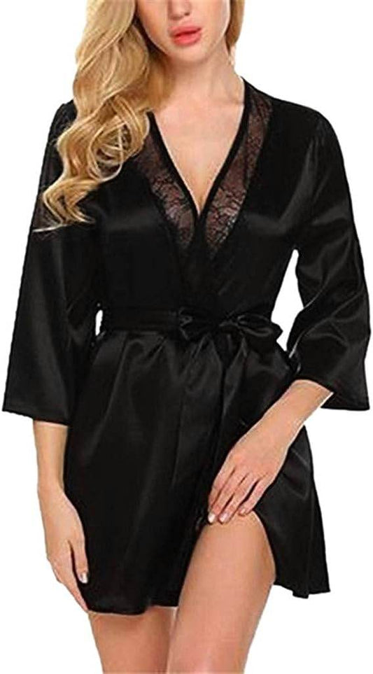 Pajamas Women Casual Black Simulation Silk Satin Kimono Robe Lace Bandage Bathrobe Lingerie Sleepwear Pajamas