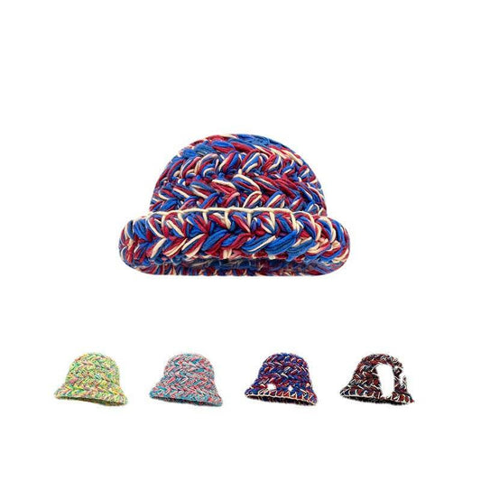 Japanese-Style Retro Mixed Color Thick Needle Handmade Knitted Wool Bucket Hat Female Autumn and Winter Thick Warm Curled Brim Basin Hat