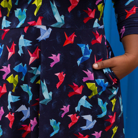 Adult "Flight of Fancy" Origami Birds V-Neck A-Line Dress with Sleeves and Pockets