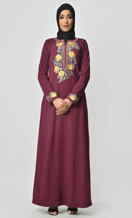 Floral Knitted Jersey Embroidered Abaya - Maroon