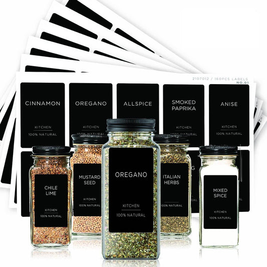 Minimalist Spice Labels Set w/Extra Black Text on White, waterproof Matte For Jars, Glass Containers & Canisters - 160 Preprinted 1.375 inch X 2.125 inch - Includes an Exclusive Reference Sheet