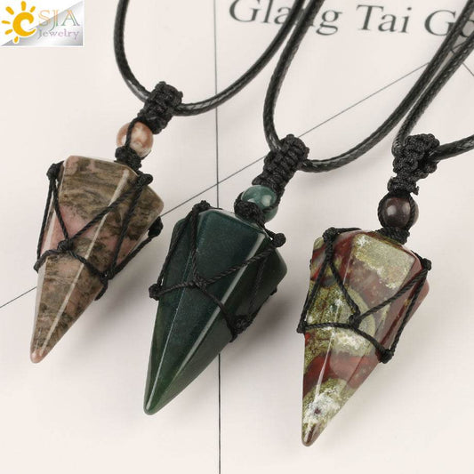 CSJA Natural Stone Cone Pendants Crystal Quartz Black Rope Wrapped Treatment Stones Necklace for Men Female Fashion Jewelry G173