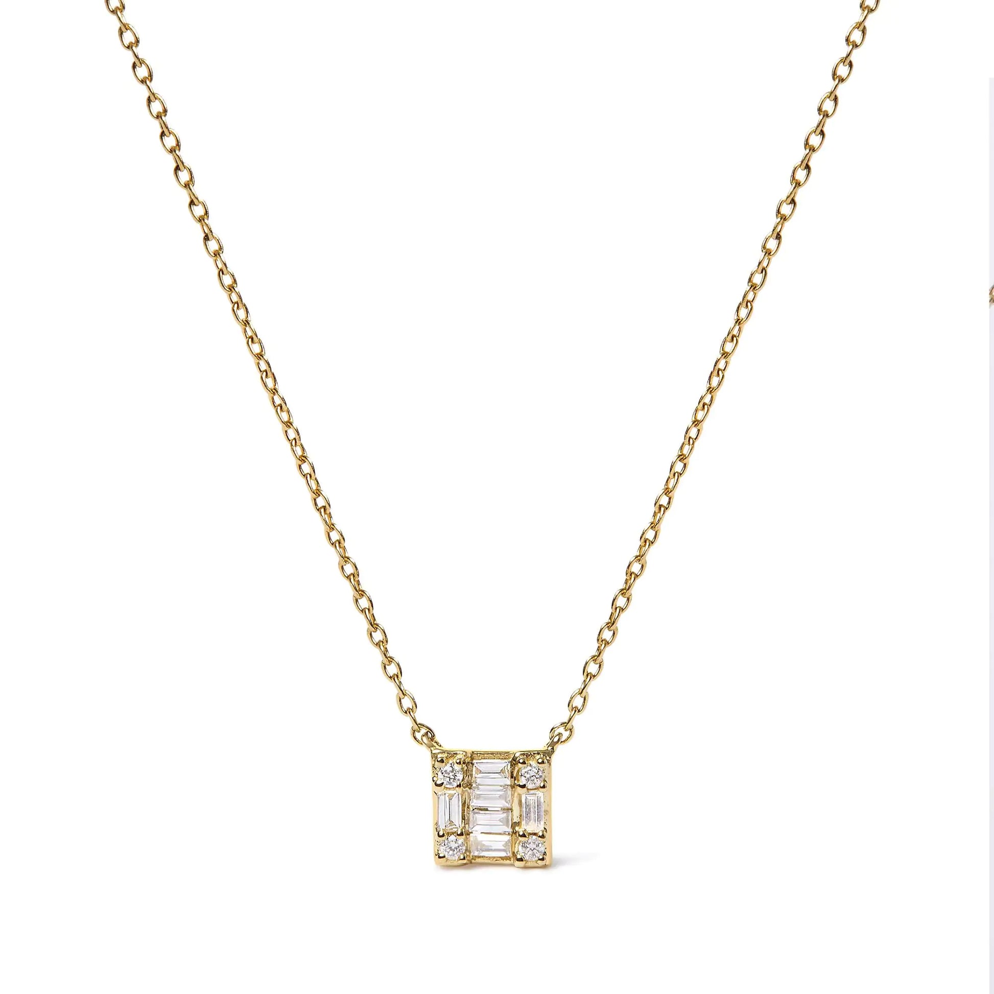 10K Yellow Gold 1/10 Cttw Round and Baguette Diamond Mosaic Composite Square 18" Inch Pendant Necklace (H-I Color, I1-I2 Clarity)