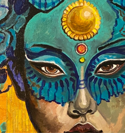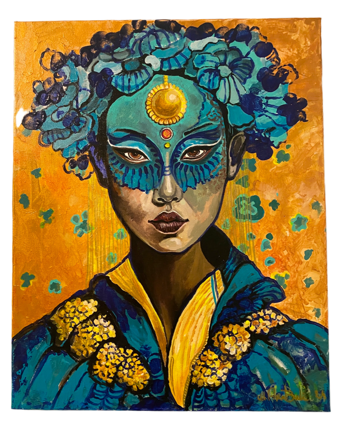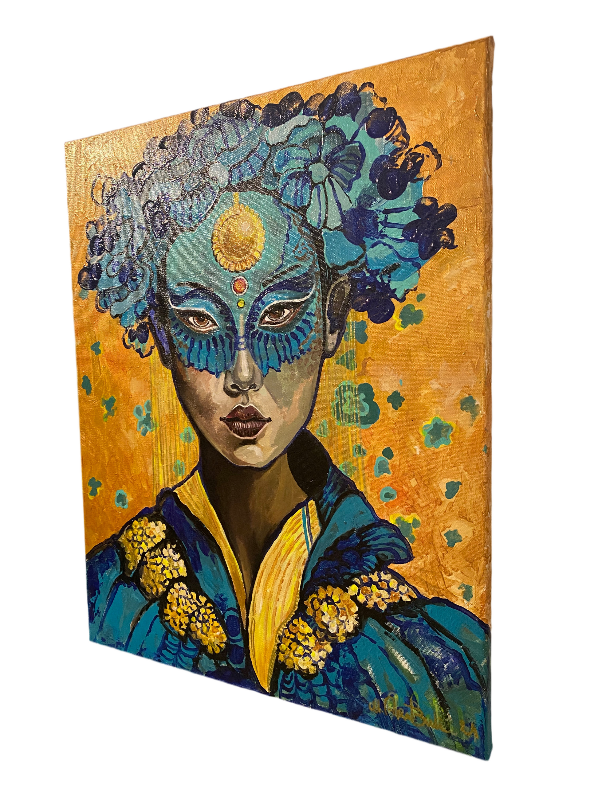 The Asian Beauty (Celestial Mask )is an original acrylic painting by Georgian artist Maia Arabuli. This striking portrait blends fantasy and symbolism, featuring a mysterious woman adorned with a radiant headpiece and a bold, blue mask that accentuates her intense gaze. Surrounded by an explosion of florals and deep gold textures, the figure embodies power, elegance, and mysticism.