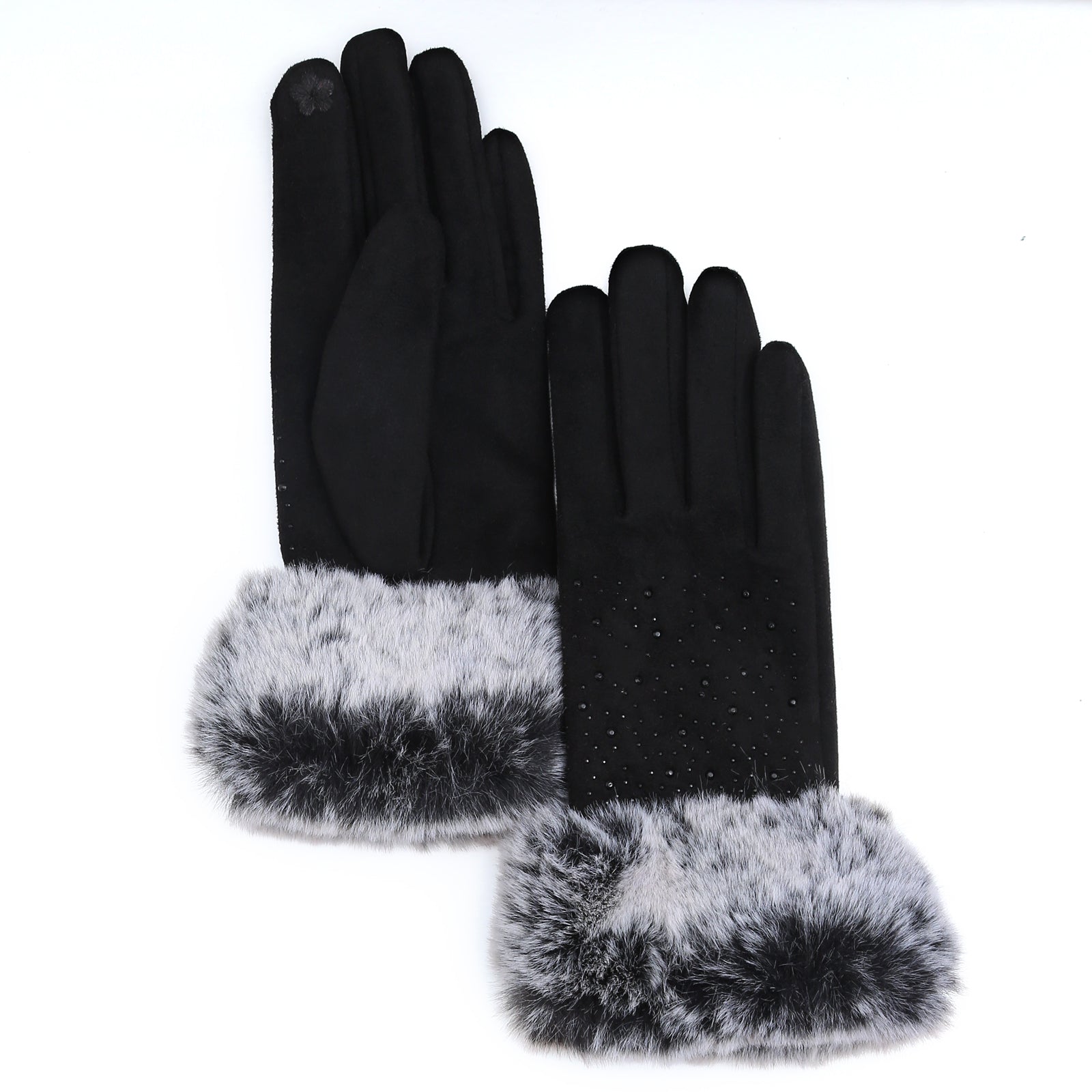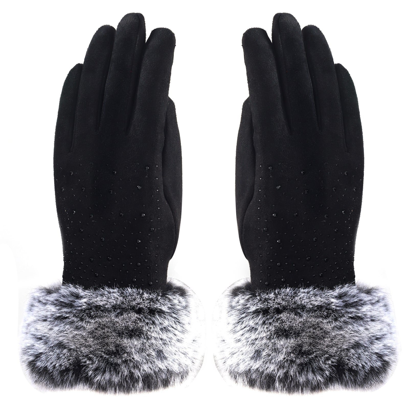 Audrey Faux Fur Gloves in Black with Black Crystals