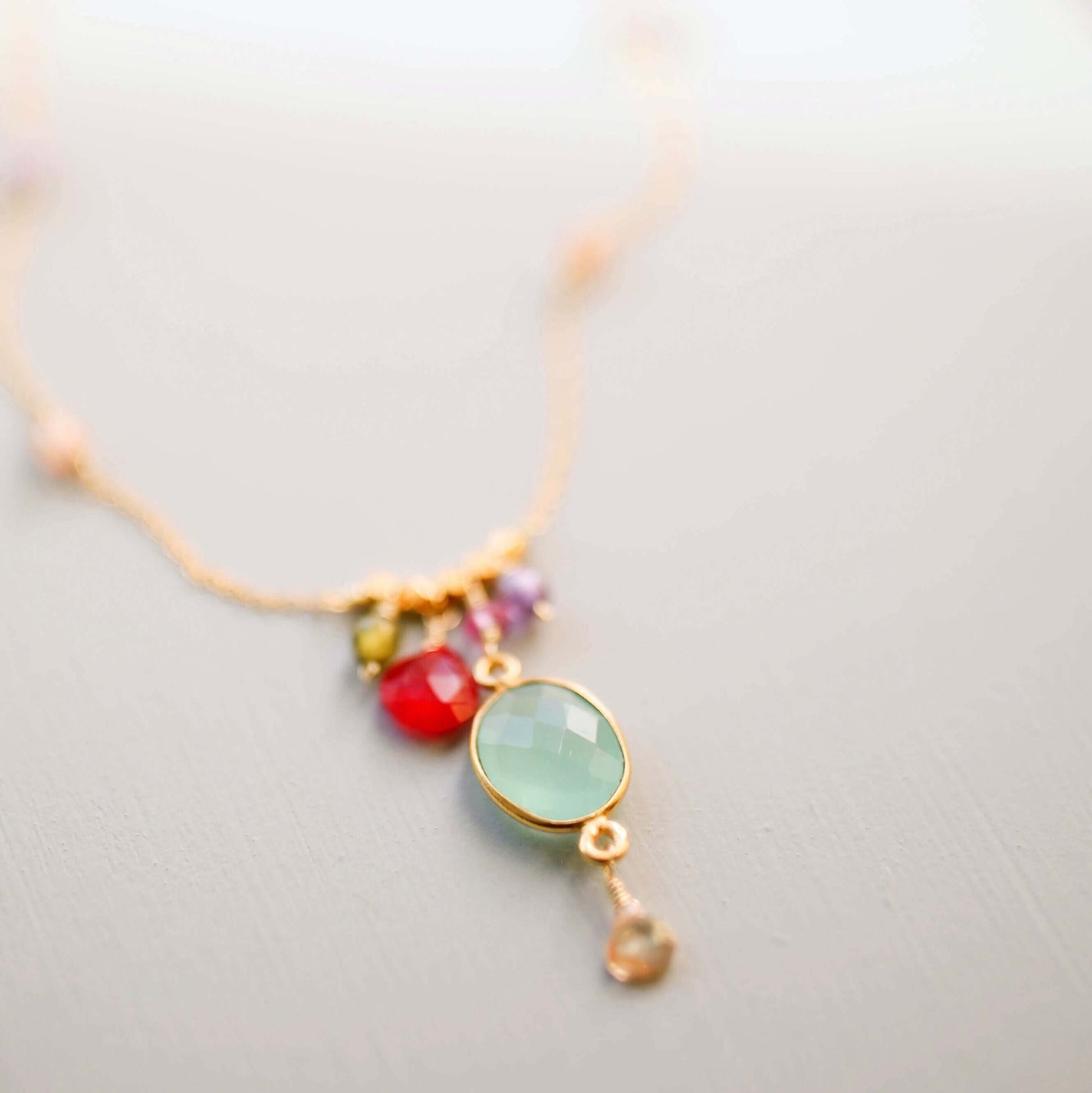 Jeweled necklaces on a delicate gold chain.