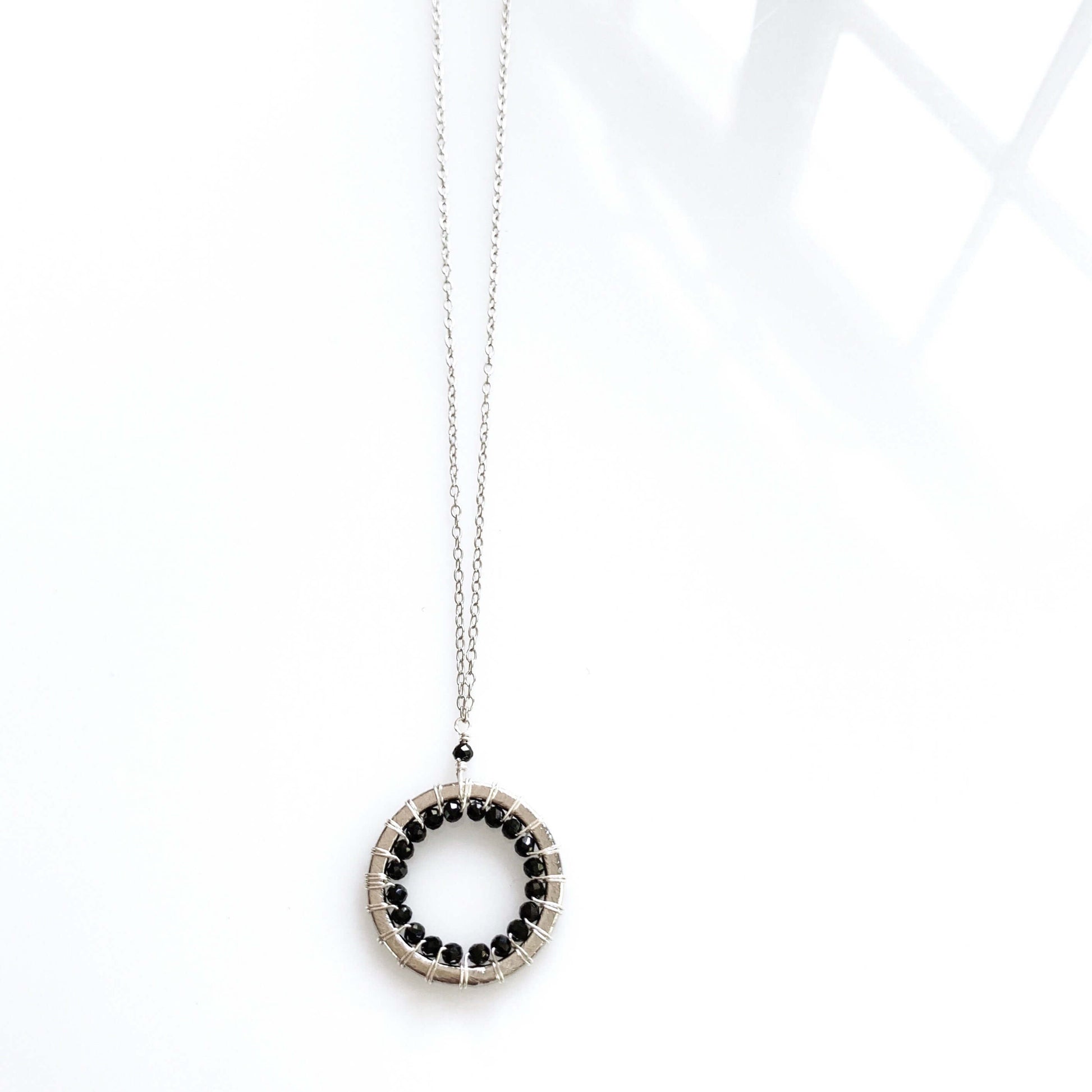 The Halo collection was our very first one. Intended to symbolize the intricate, universal energy woven within us all. This beautiful necklace is ultra lightweight and perfectly handmade featuring sparkling Black Spinel gems woven into our unique, mini floating pendant design.