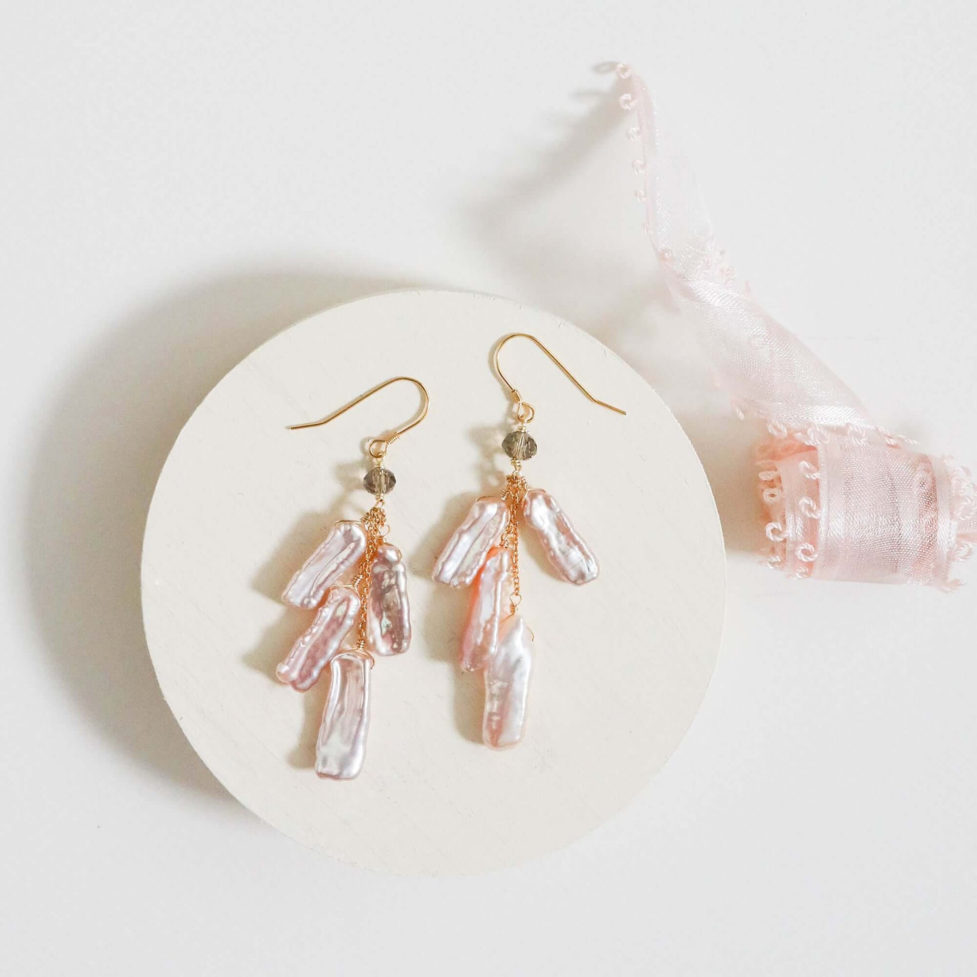 Hanging tiers of blush pink freshwater stick pearls paired with a beautiful smoky quartz accent gemstone