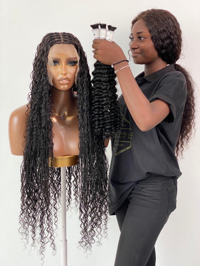 This scalp-looking glueless bohemian knotless braid wig is made with 100% human hair down to the curls, a stretchable HD full lace cap, and a fine blend of quality kanekalon fiber for extra length. It has 3-4 combs inside, an adjustable rubber band, baby hair, and a snap hook for secured installation. The hair root is 1B, the hair color is 1B, the length is waist length, and the weight is approximately 58-70 grams. It can last for up to 2-3 years if properly maintained. Studies show that braiding your natural hair or using harsh shampoo for an extended period causes long-term alopecia, baldness, and unbearable pain. With a poshglad braided wig, you don't have to worry about any of that. Just put your wig on and go—nobody will know it's a wig.