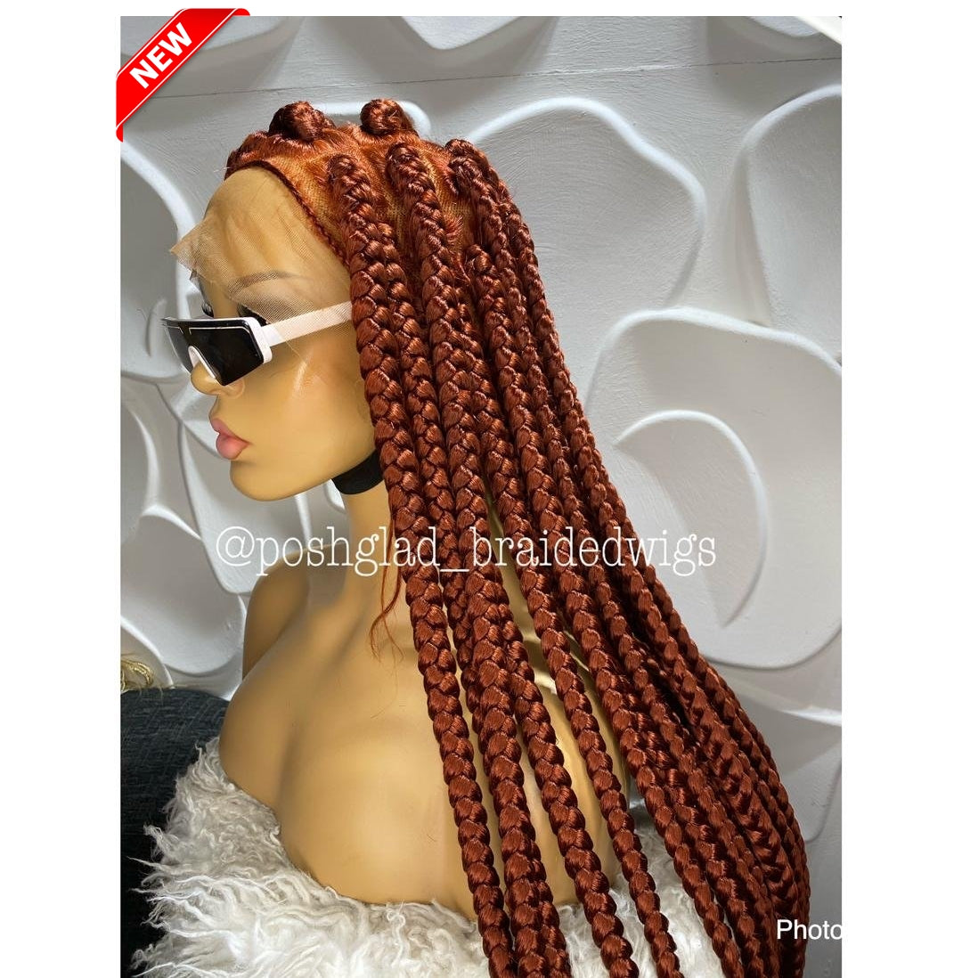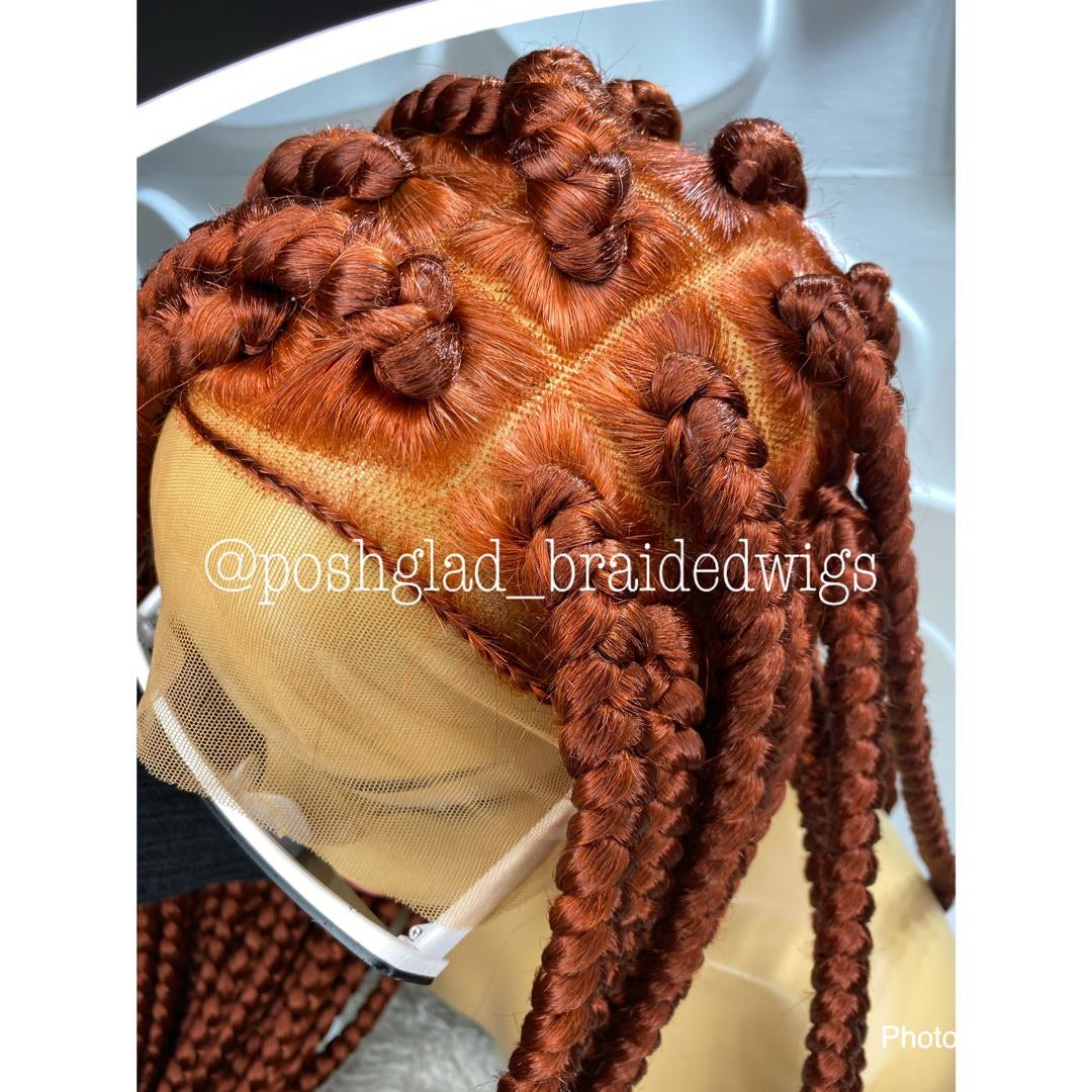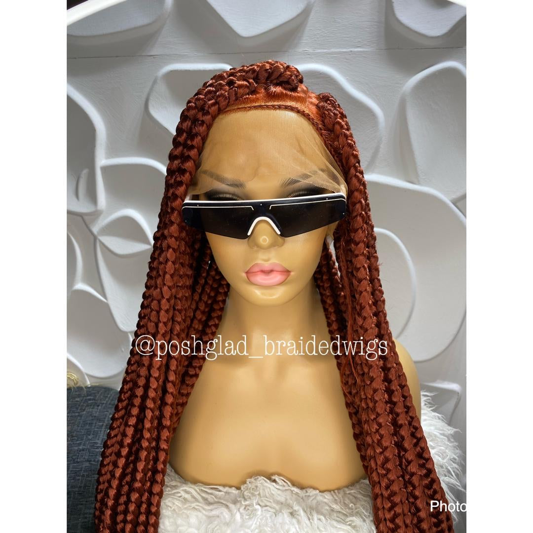 This style of Kemi jumbo box braid wig in COPPER RED is made with 100% FULL LACE with baby hair. It is neatly and tightly done for a long lasting use.. No more sitting down for 12 hours in a salon, like gurrrl No. Get your wig on and go. Study shows that braiding on your natural hair causes long term alopecia, an unbearable pain and that Ostrich neck after sitting down for 12 hours lol. With poshglad braided wig, just put your wig on and go, no time to waste.
