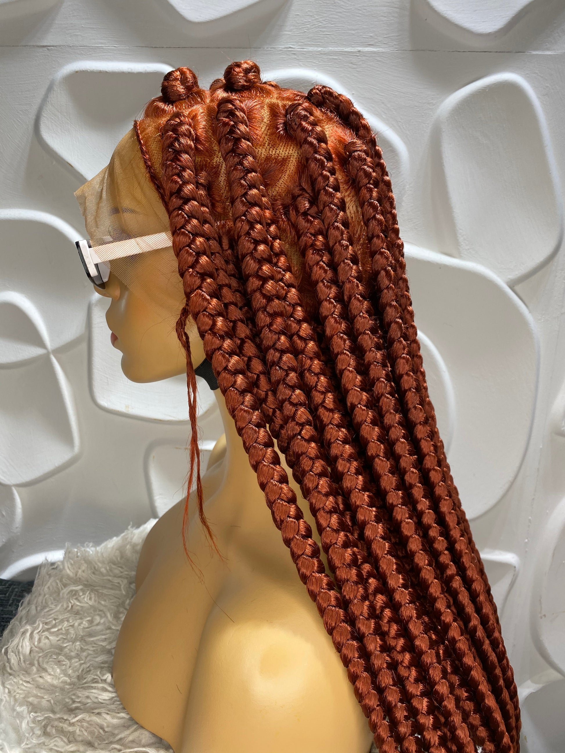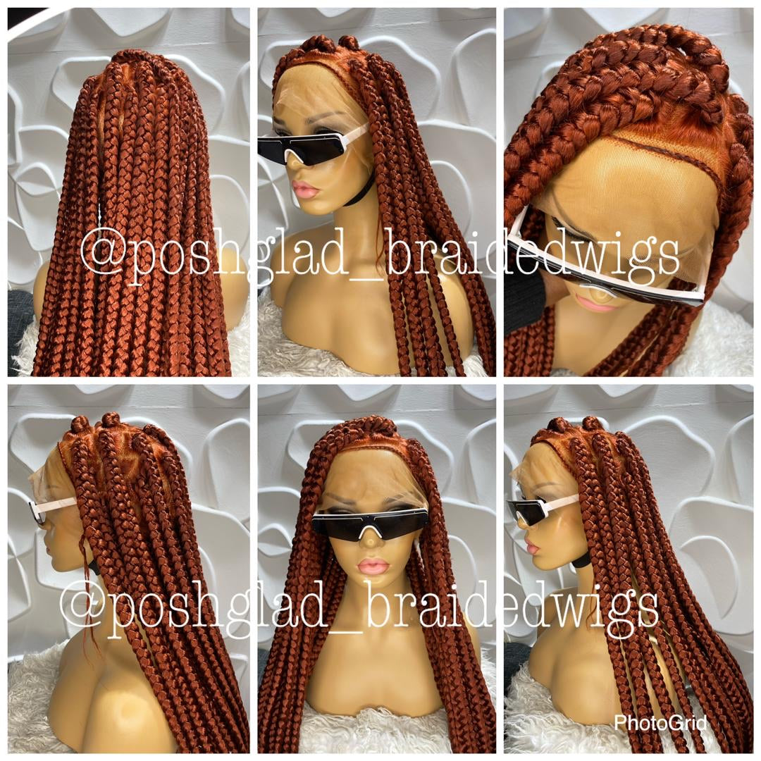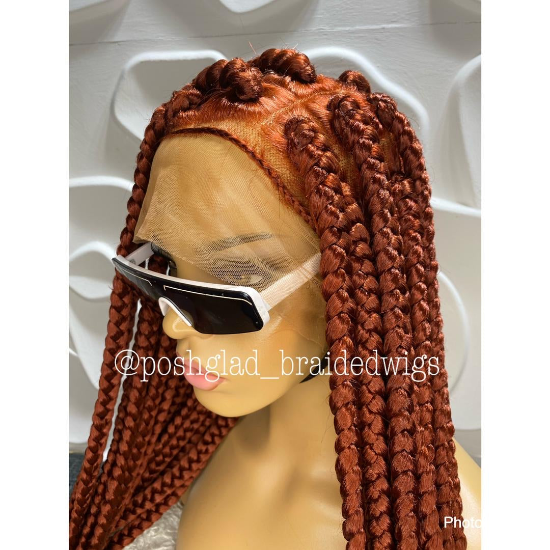 This style of Kemi jumbo box braid wig in COPPER RED is made with 100% FULL LACE with baby hair. It is neatly and tightly done for a long lasting use.. No more sitting down for 12 hours in a salon, like gurrrl No. Get your wig on and go. Study shows that braiding on your natural hair causes long term alopecia, an unbearable pain and that Ostrich neck after sitting down for 12 hours lol. With poshglad braided wig, just put your wig on and go, no time to waste.