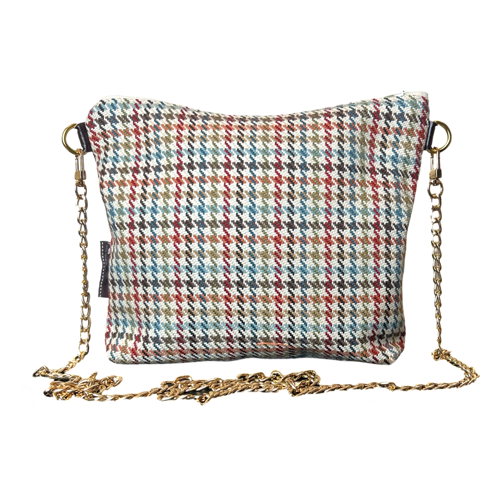 Vintage Hermès Couvertures et Tenues du Jour scarf front paired with coordinating houndstooth plaid reverse. Zippered closure with removable 23" drop gold-tone crossbody chain.