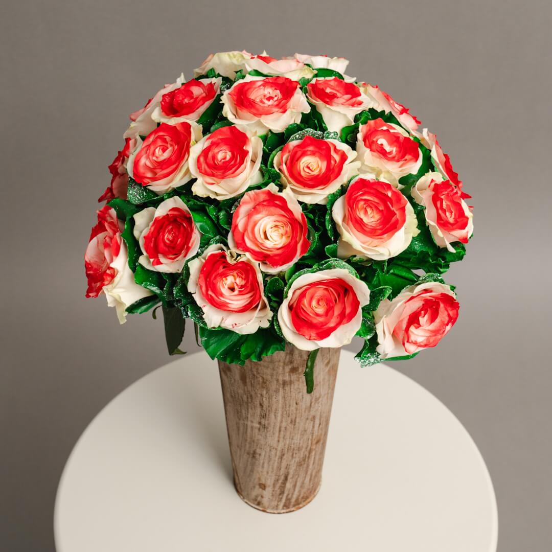 The harmonious combination of red and green roses with white stripes in the bouquet "Crimson Frost" creates a multifaceted picture of the path of love - from the fiery passion of red to the evergreen aspirations of green and pristine purity of white.