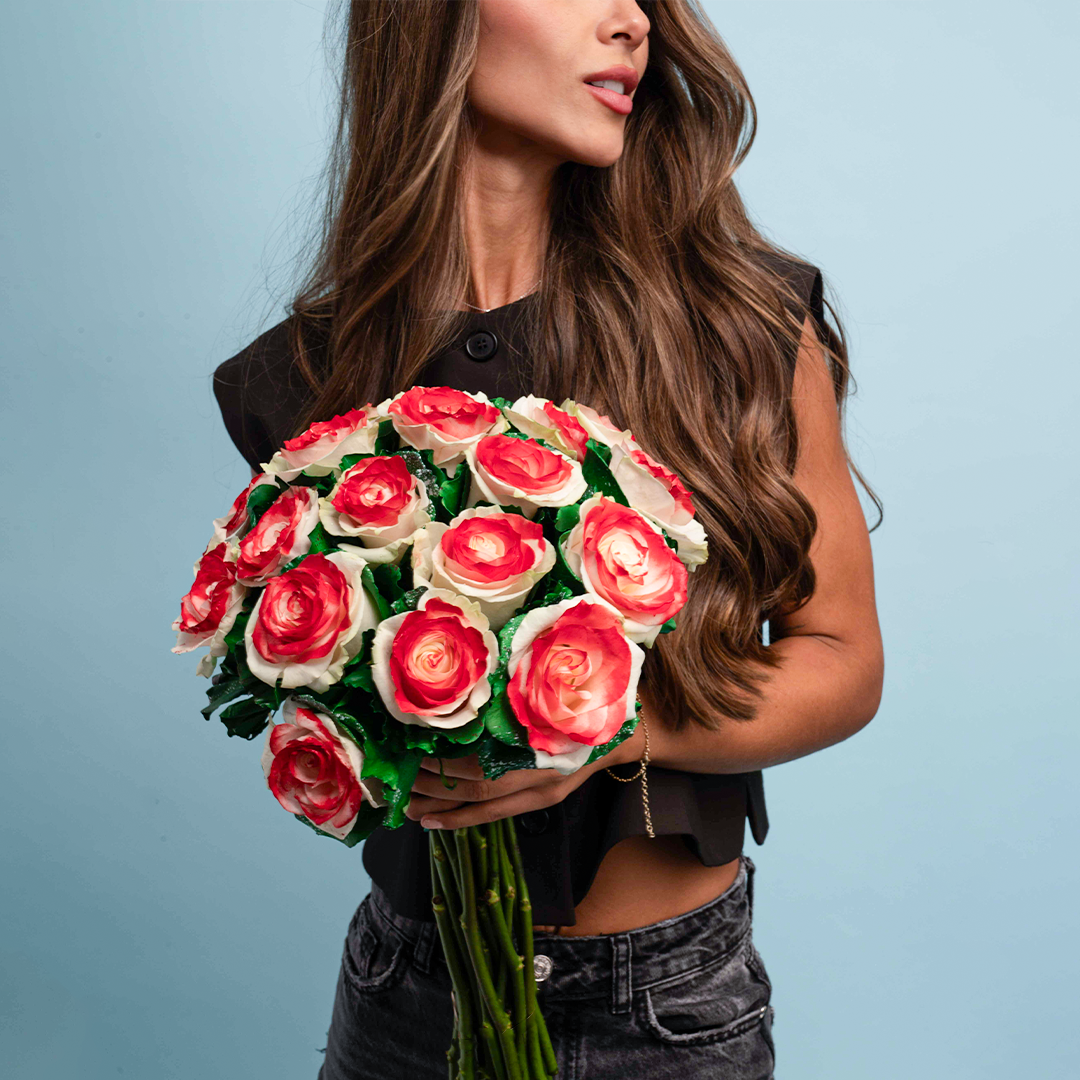 The charming bouquet "Crimson Frost" by Rosaholics weaves a deep tapestry of emotions. And all because we carefully selected the colors of flowers: red, white and green roses. But, most importantly, it's not just three different colors in one bouquet. Each of these three colors is intertwined on one rose. Why? Because we want to convey the feeling of each color on each flower:
