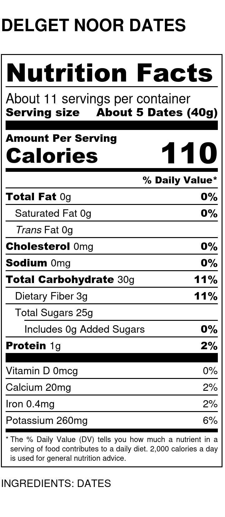 Deglet Noor dates are less moist than its counterparts but are just as sweet with a delicate flavor and great chew. They are a golden-amber in color with translucent skin.