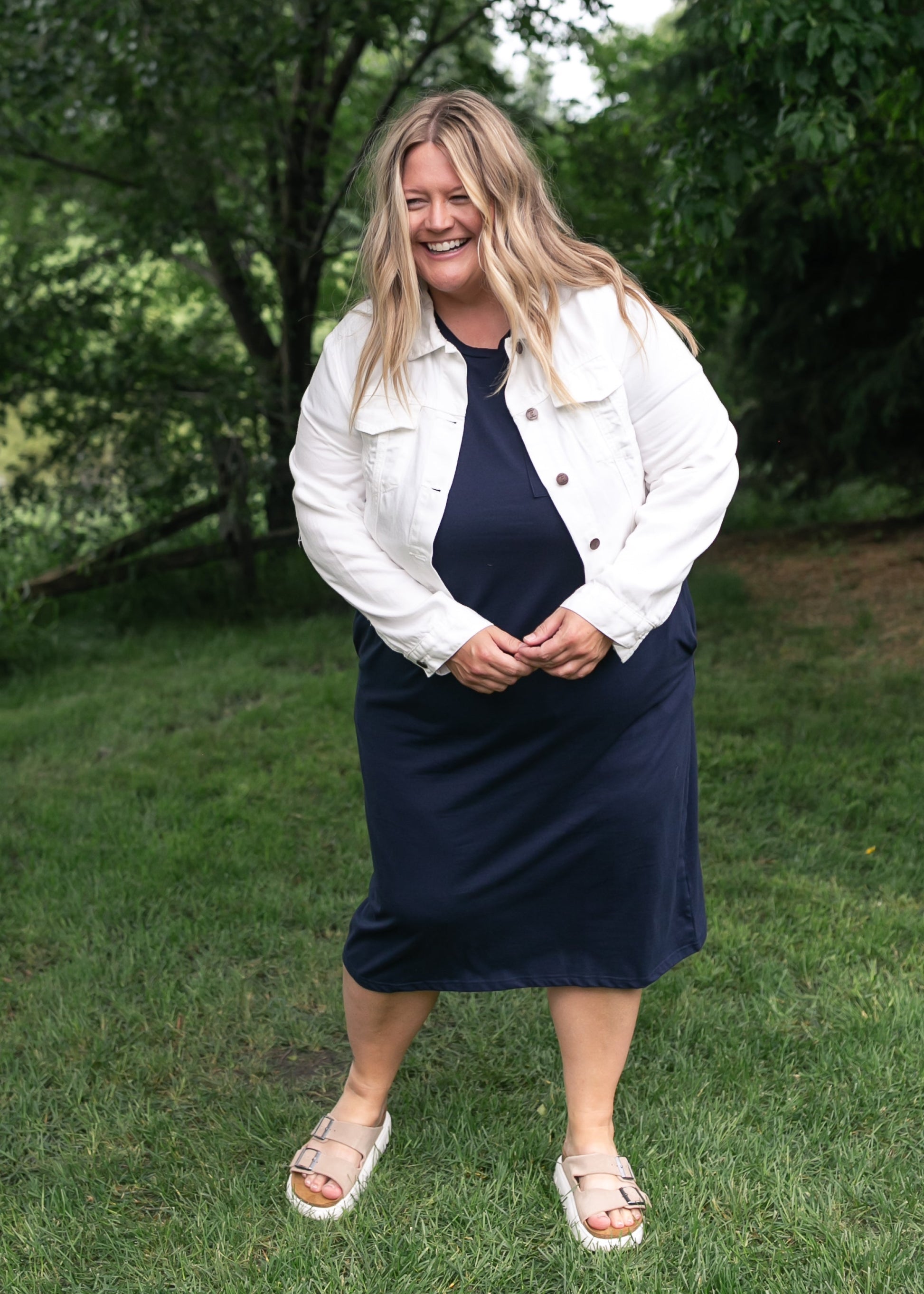 The Finley T-Shirt Midi Dress is an Inherit Design that has fabric that lets this style breath, stretch and move with you though your day and night! The rolled sleeve elevate the dress and that front pocket on the left side is of course adorable. Don't fear, we didn't leave the hidden side pockets out either, your hands will be oh-so-happy!! No slit in this dress, so you'll be confidently covered and ready to relax or run those errands! This elevated casual dress comes in sizes XS-4XL with plus sizes available! Use this comfy dress to create an outfit that pairs perfectly with sneakers!