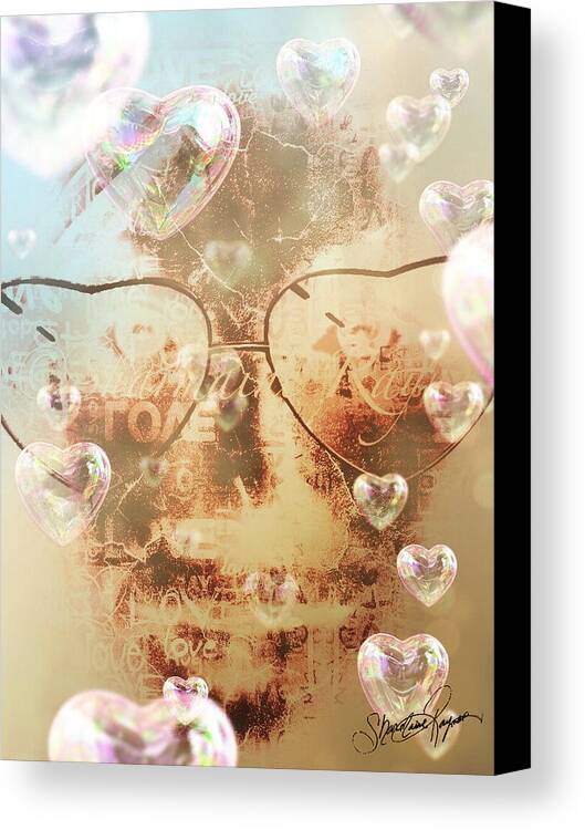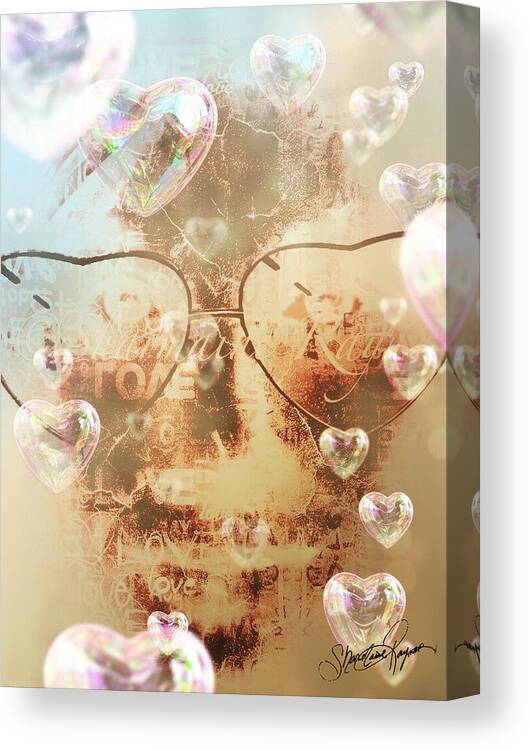 A face with heart-shaped glasses is subtly visible amidst a dreamy overlay of translucent hearts. The background features faint, cursive text adding a whimsical and romantic atmosphere.