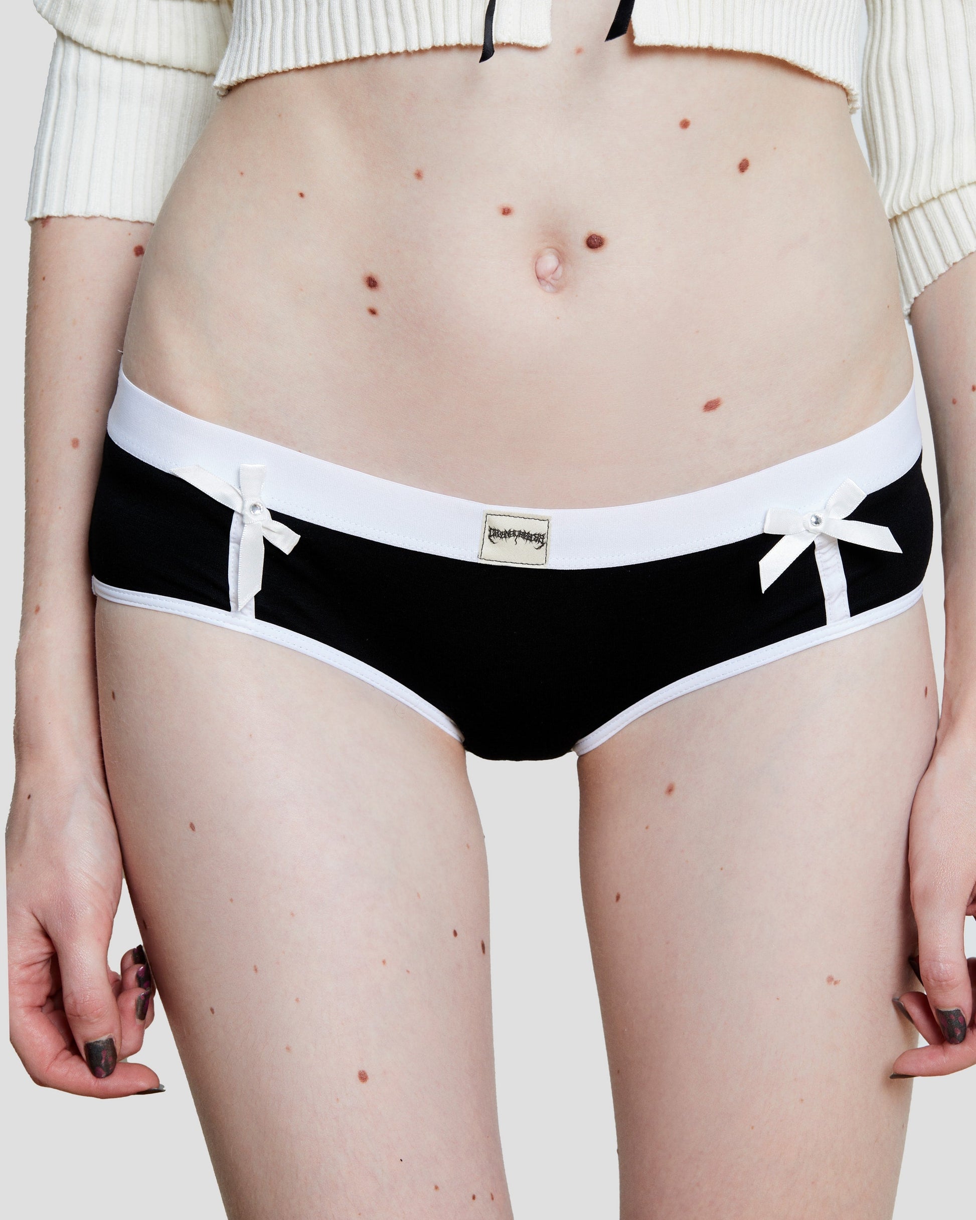 The Kitty Girl Boyshort is a soft and cheeky rework of the classic men’s brief—feminized for the coquette rebel. Made in a silky modal-blend with stretchy spandex, this panty sits low with a comfy waistband, contrast white trim, and pearl-topped satin bows that bring the drama.