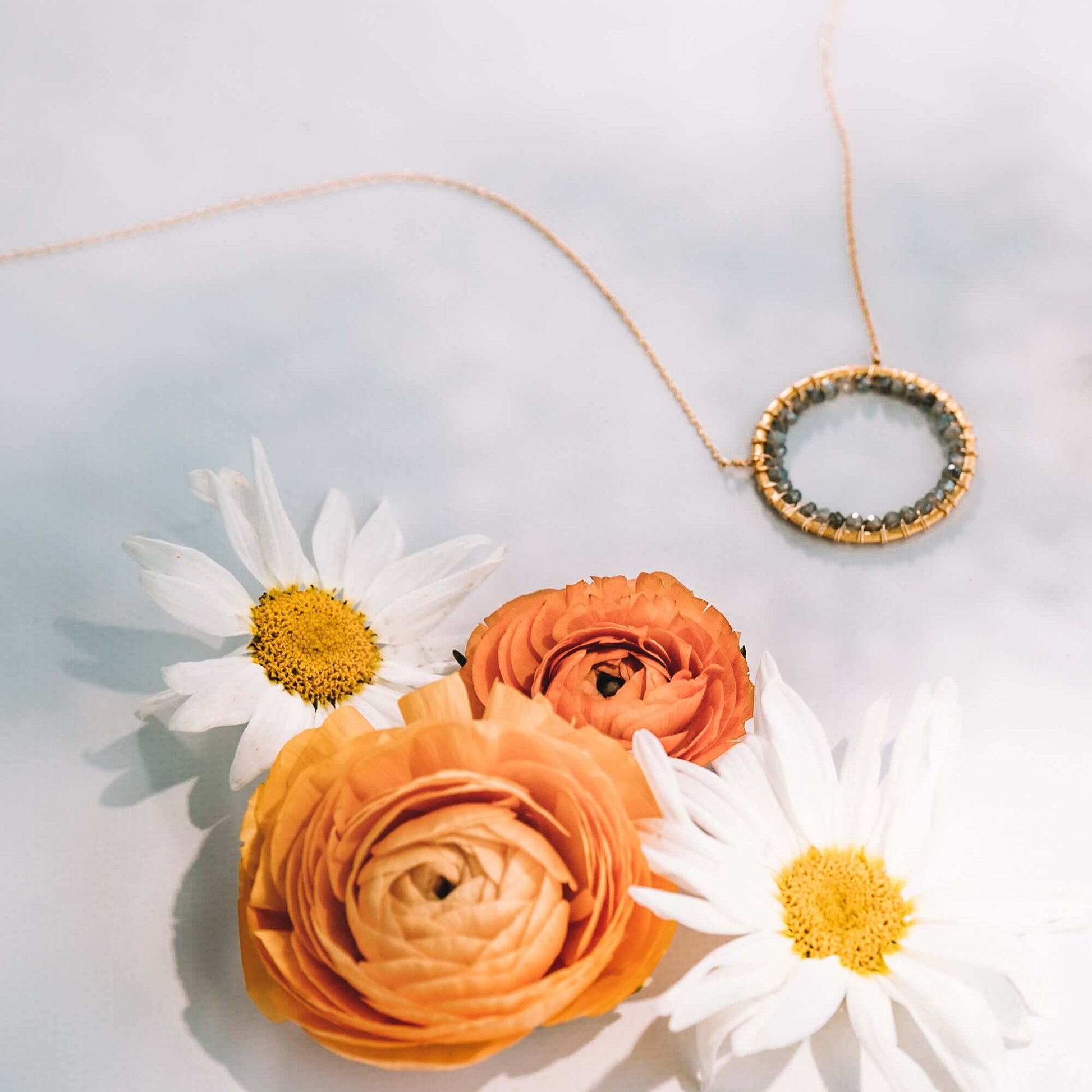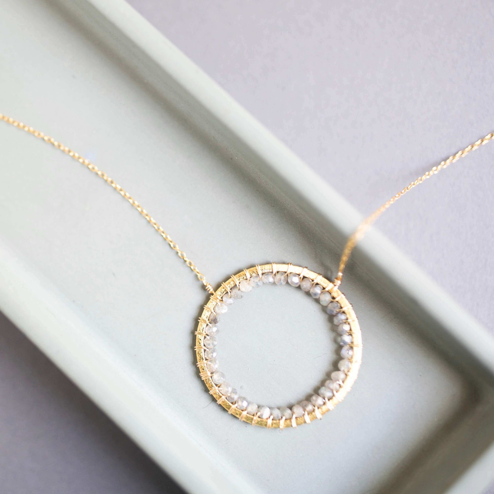 The Halo collection was our very first one. Intended to symbolize the intricate, universal energy woven within us all. This beautiful necklace is ultra lightweight and perfectly handmade featuring sparkling Labradorite gems woven into our unique floating pendant design.