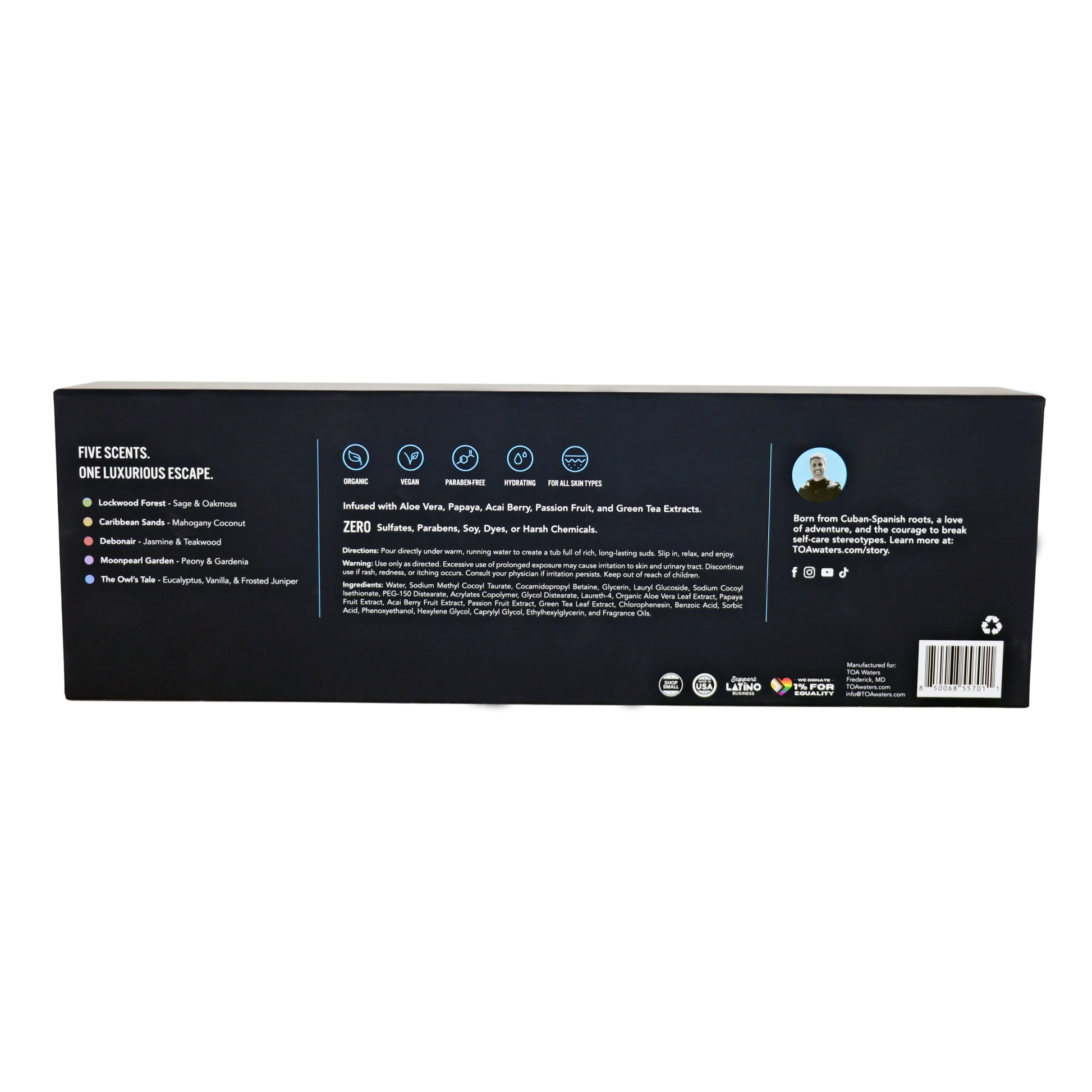 Each liquid bath bomb is enriched with aloe vera, papaya, acai berry, passion fruit, and green tea extracts to hydrate, soothe, and revitalize. Formulated without sulfates, parabens, dyes, or harsh chemicals. Just clean ingredients for all skin types.