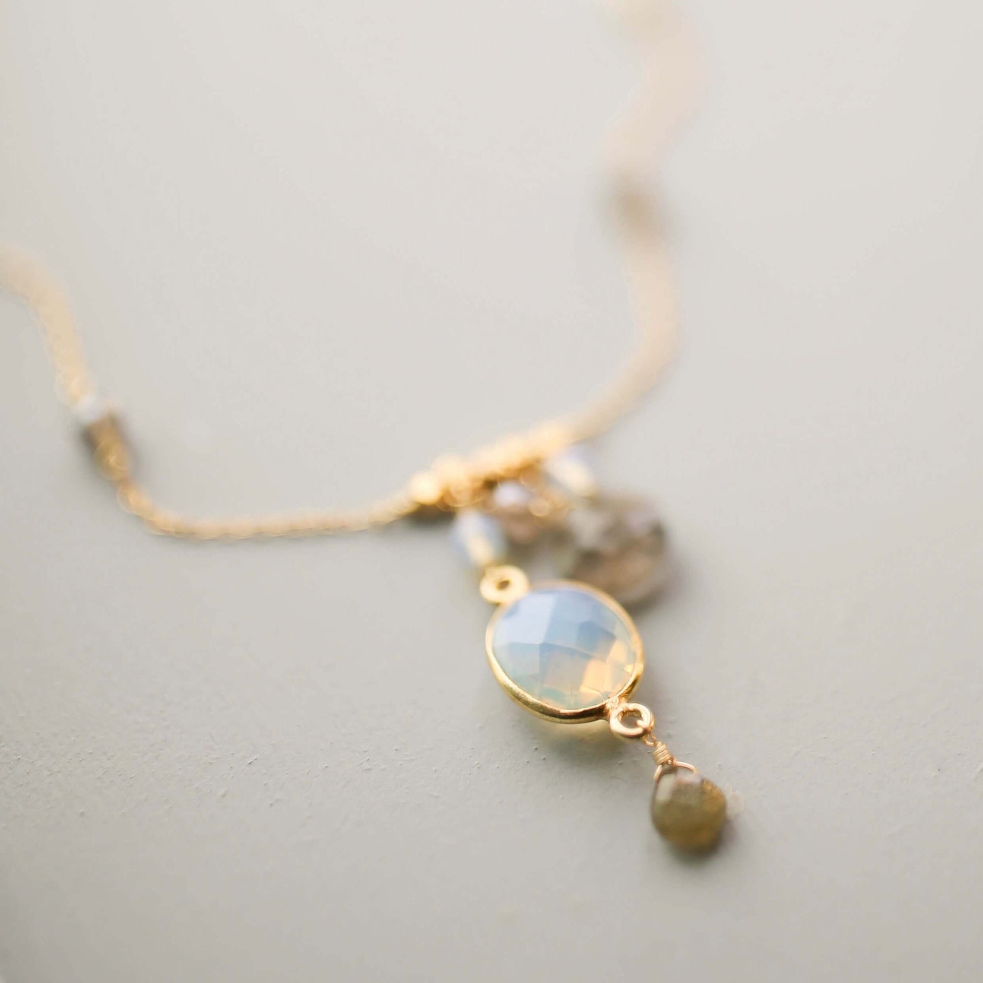 Jeweled necklace on a delicate gold chain. Beautiful bezel set opal quartz gemstone surrounded by labradorite accent stones.