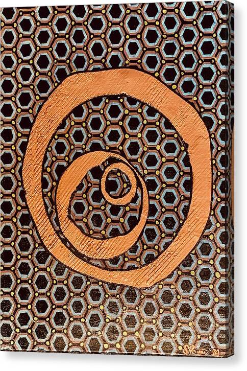 About the original piece: I completed this abstract piece during Pluto's last retrograde into Capricorn for the next 300 years. The copper, black, and grey in this pattern remind me of some retro fabrics and prints from the 70's. A large concentric circle design in french plaster and copper foil is set against a black background filled with a hexagonal grid pattern. The contrast between the spiral and the geometric grid creates a dynamic visual effect.