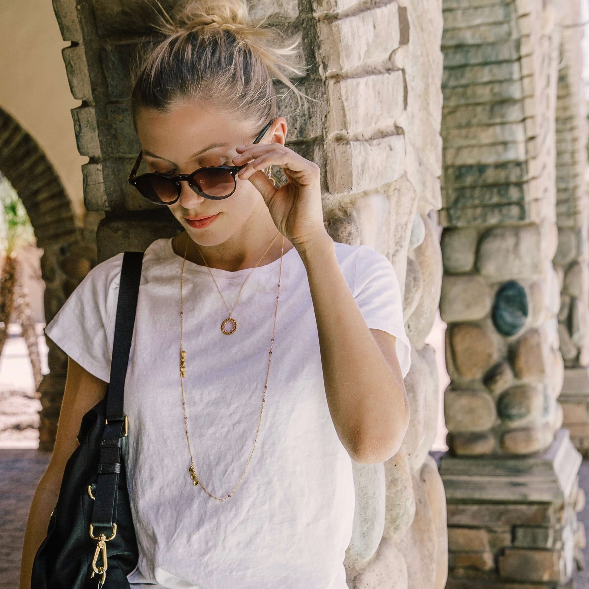 The Halo collection was our very first one. Intended to symbolize the intricate, universal energy woven within us all. This beautiful necklace is ultra lightweight and perfectly handmade featuring sparkling Rose Quartz gems woven into our unique, mini floating pendant design.