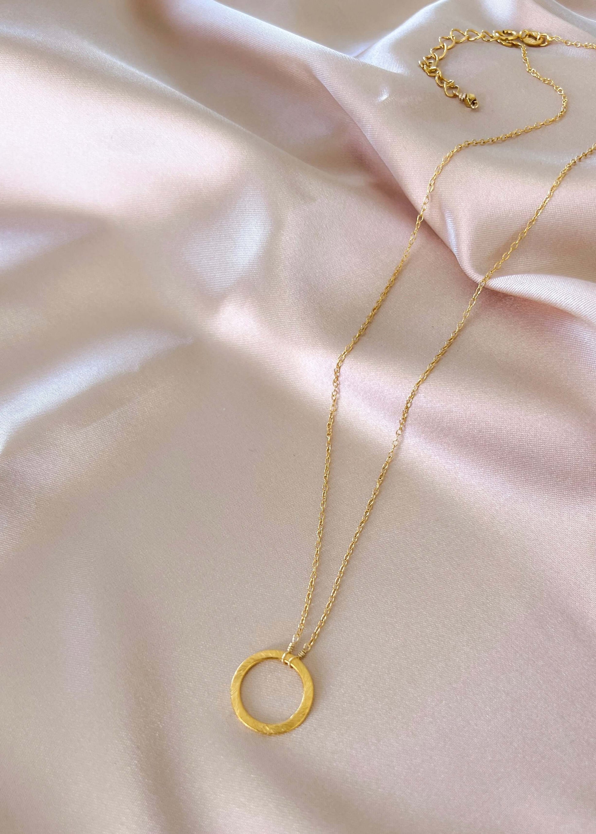 Our signature gold circle necklace is designed for layering over any necklace in our collection. Handmade, tarnish resistant 14k gold plated chain. Adjustable between 16"-18".