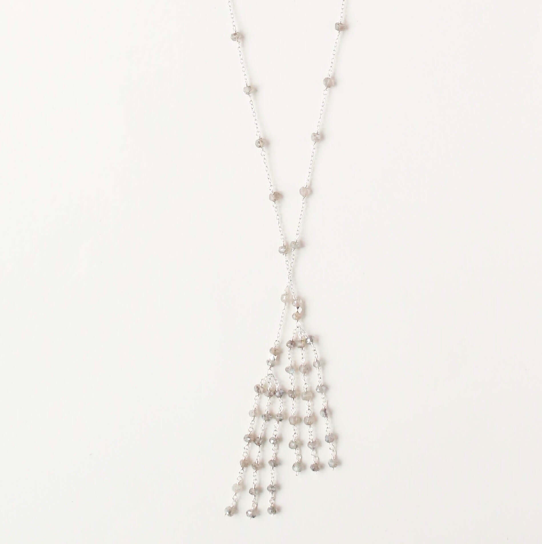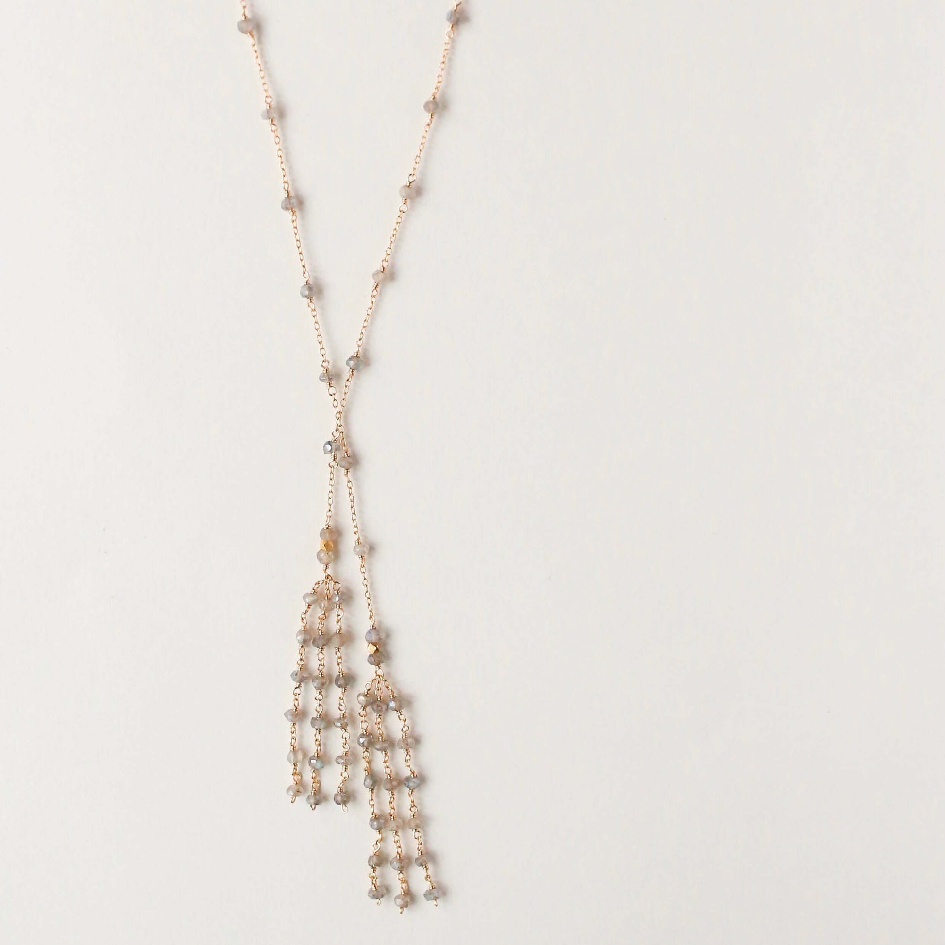 Delicate lariat necklace made with labradorite gemstones and finished off with a beautiful tassel design. Designed as a shorter lariat so it falls mid-chest.