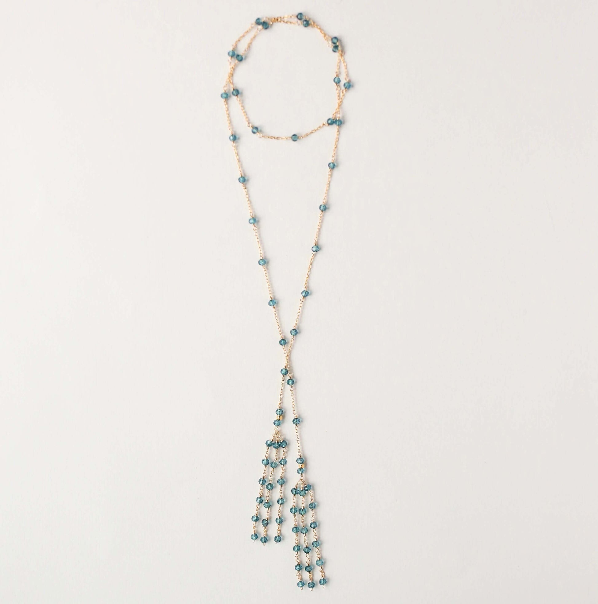Delicate lariat necklace made with london blue quartz gemstones and finished off with a beautiful tassel design. Designed as a shorter lariat so it falls mid-chest.