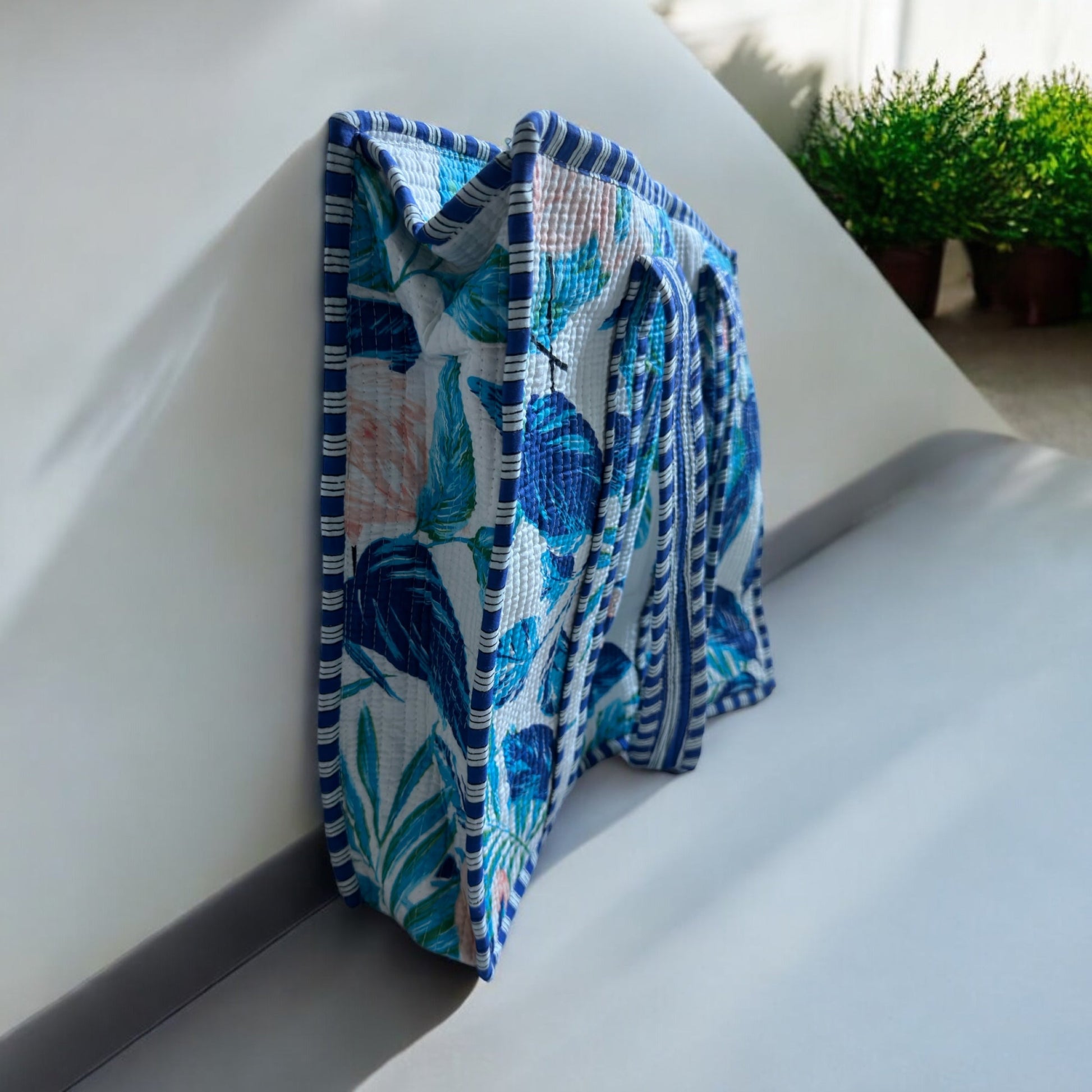 Expertly made by skilled craftspeople in Rajasthan, India, this tote from Soléa beautifully showcases the traditional Indian art of hand block printing on premium cotton fabric. Combining classic craftsmanship with a modern aesthetic, each bag is uniquely quilted.