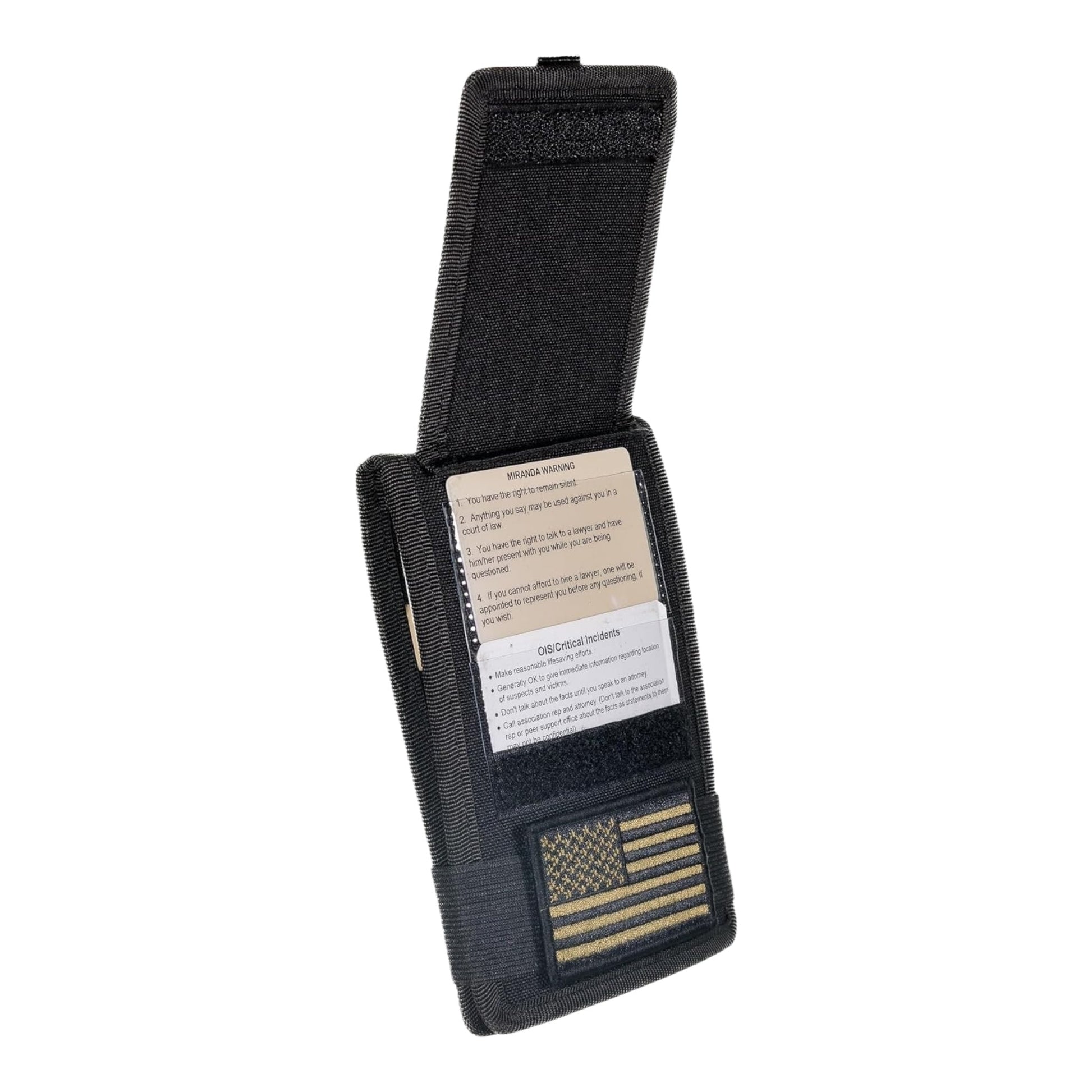 Built from rugged 1000D nylon, our full-size tactical field notebook cover is designed to fit notepads up to 4⅛ x 6¾ inches. It features two clear card slots, multiple internal pockets, a dedicated space for a standard 6-inch evidence ruler, and a rear pocket roomy enough to fit most chest seals or other flat gear. Hook and loop panels on the front and back provide space for morale patches, flags, blood type, badges, or unit tags. An integrated elastic band keeps everything secure. Durable, functional, and built for the field.