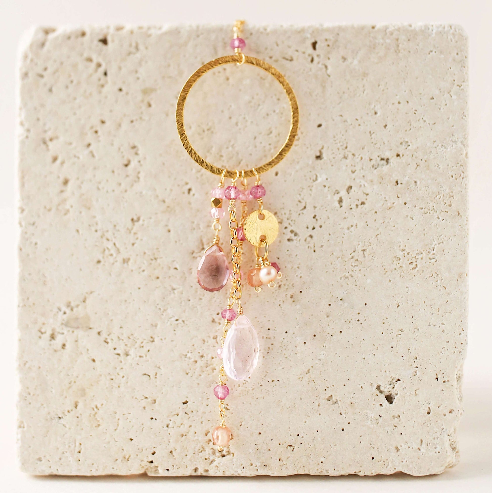 Lush rose quartz and pink tourmaline gemstone pendant necklace with strands of pink gemstone combinations dangling from a gold hoop.