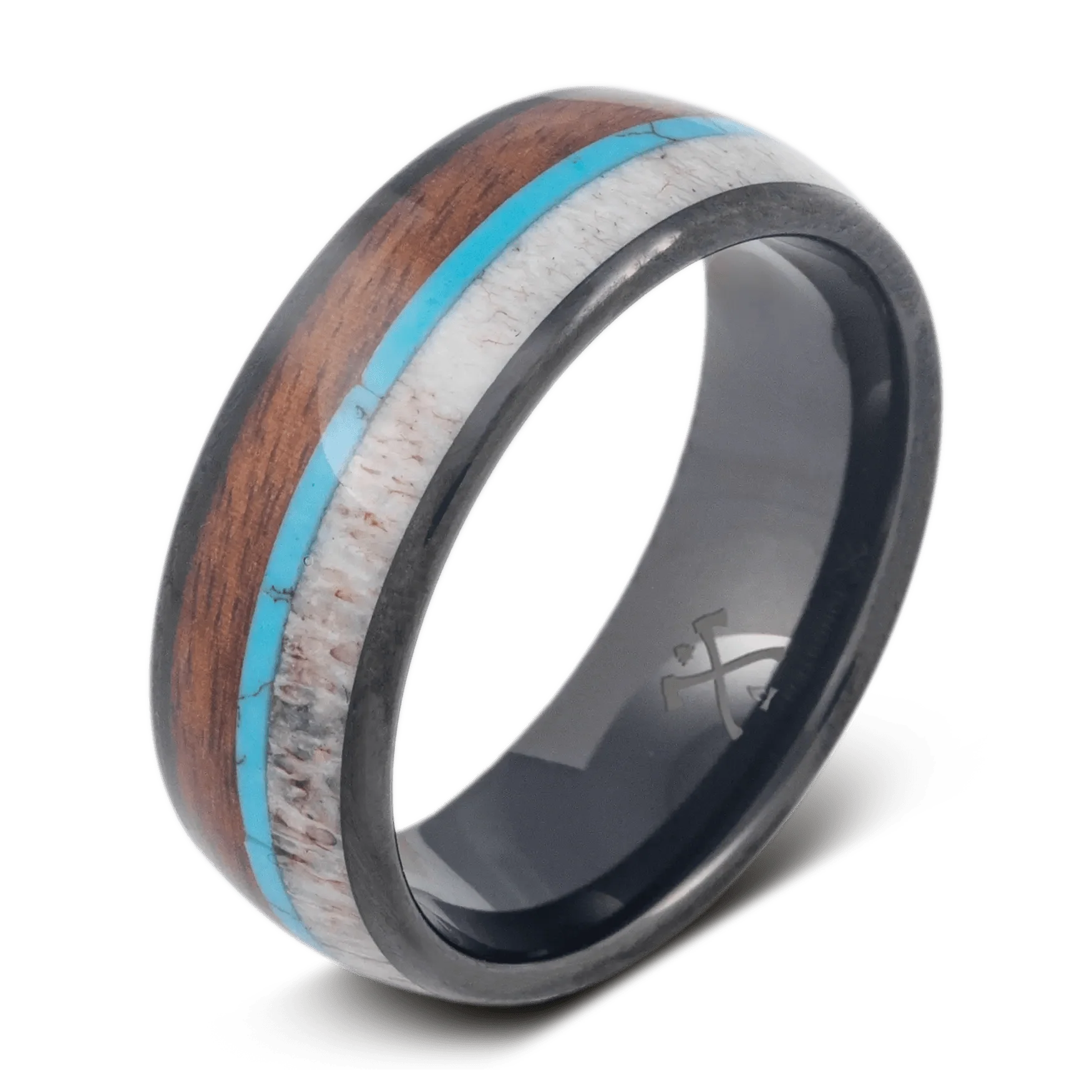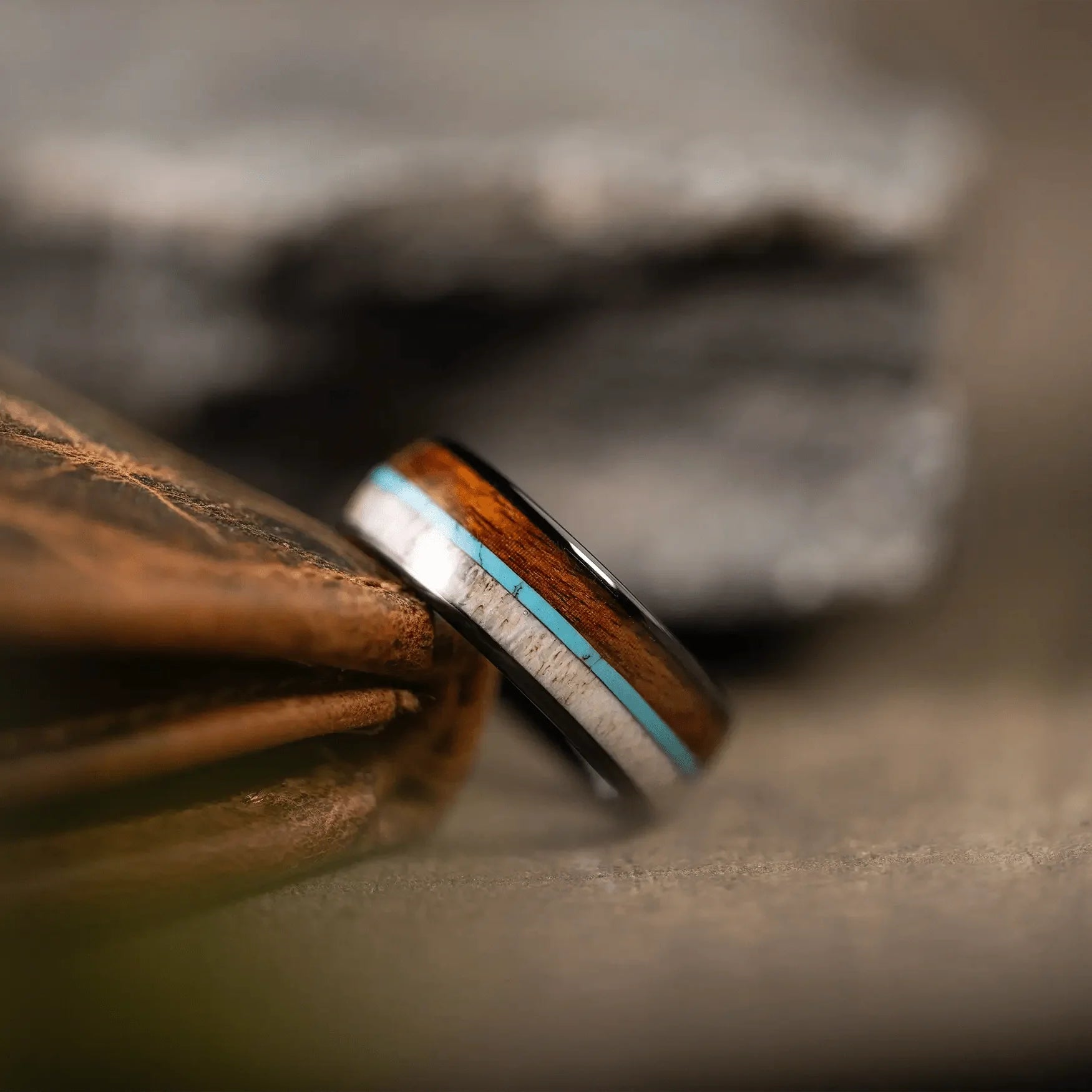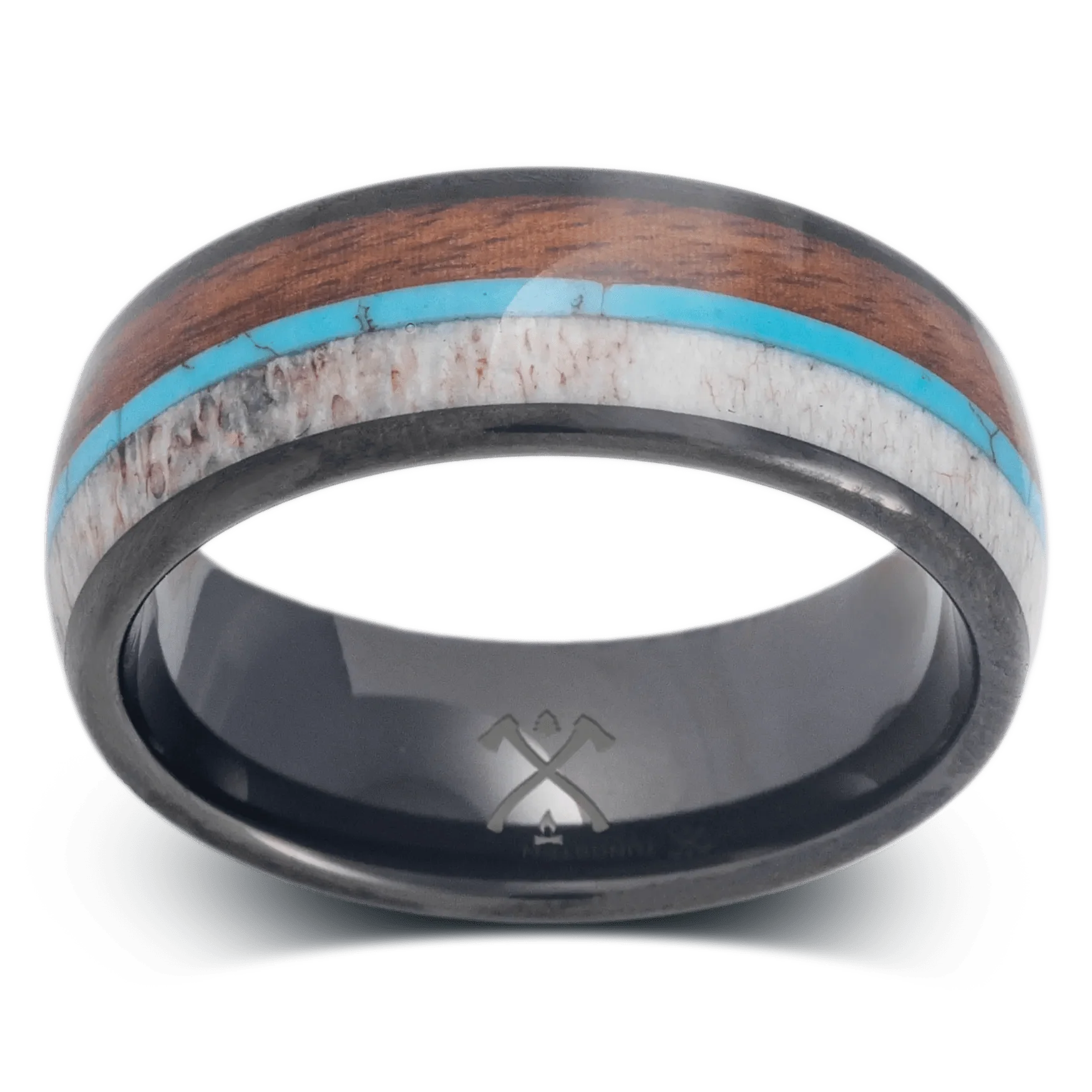 • Black Plated Tungsten with Turquoise, Deer Antler, and Koa Wood Inlays