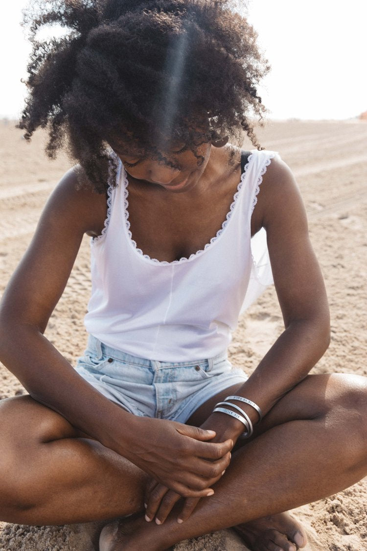 Words are powerful! These aluminum cuffs are inscribed with phrases to remind you of your worth.