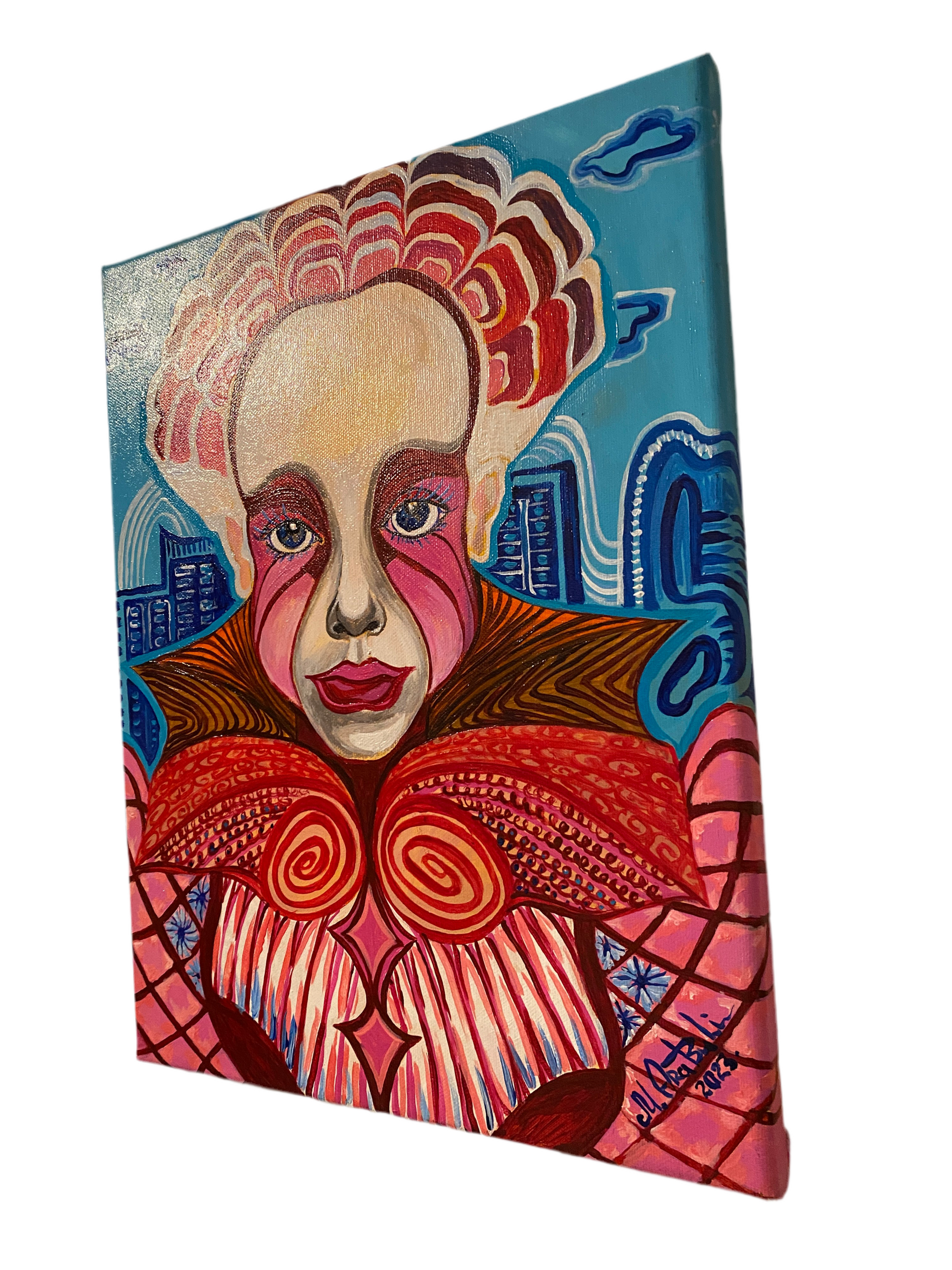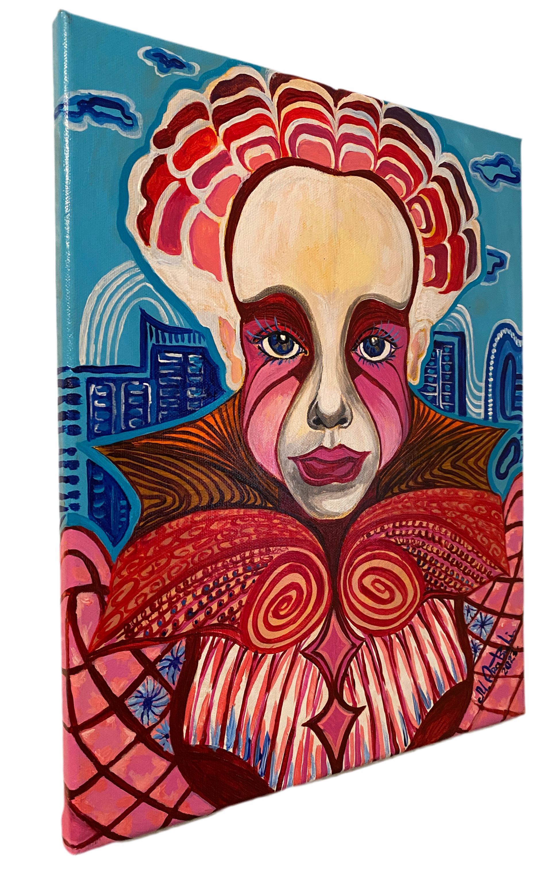 “Radiant Identity” is a vivid and expressive original painting that blends abstract, surreal, and modern influences. This striking portrait features a bold figure with an ornate, swirling costume and vibrant red and pink tones set against a playful blue cityscape background. Intricate patterns, dynamic brushstrokes, and intense eyes bring powerful emotion and energy to the composition.