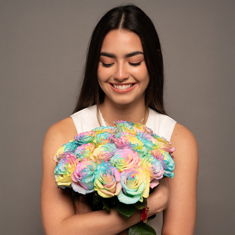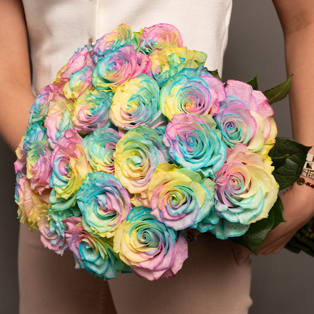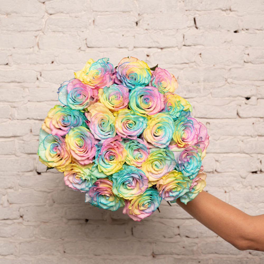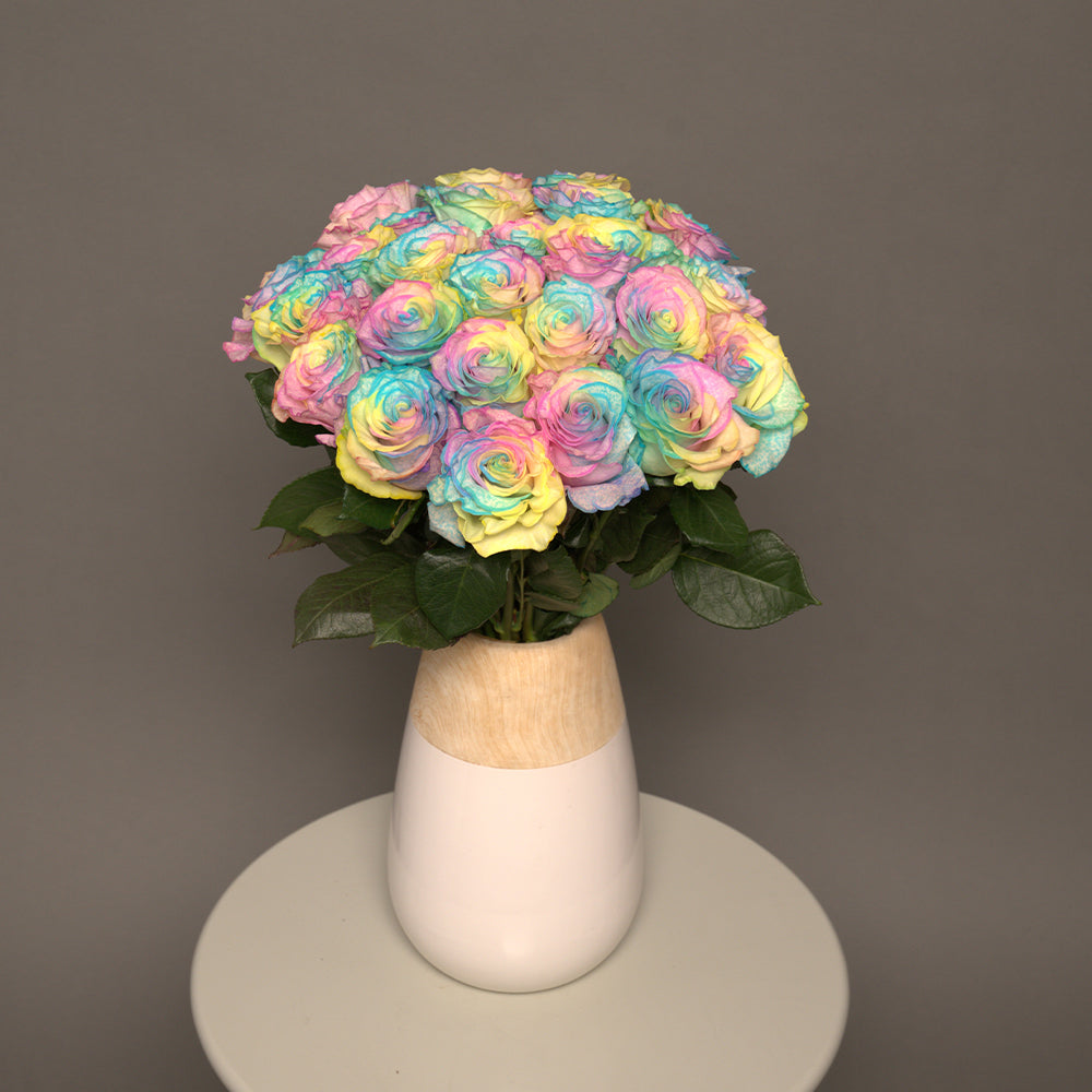 No need to wish you were a flower child of the 60s – Tie-Dye is back and bigger than ever! With a groovy kaleidoscope of colors – pastel purples, pinks, yellows, and blues – this fresh rose captures the cheer and carefree fun of the hippy lifestyle. Perfect for birthdays, parties, and everyday flower power.