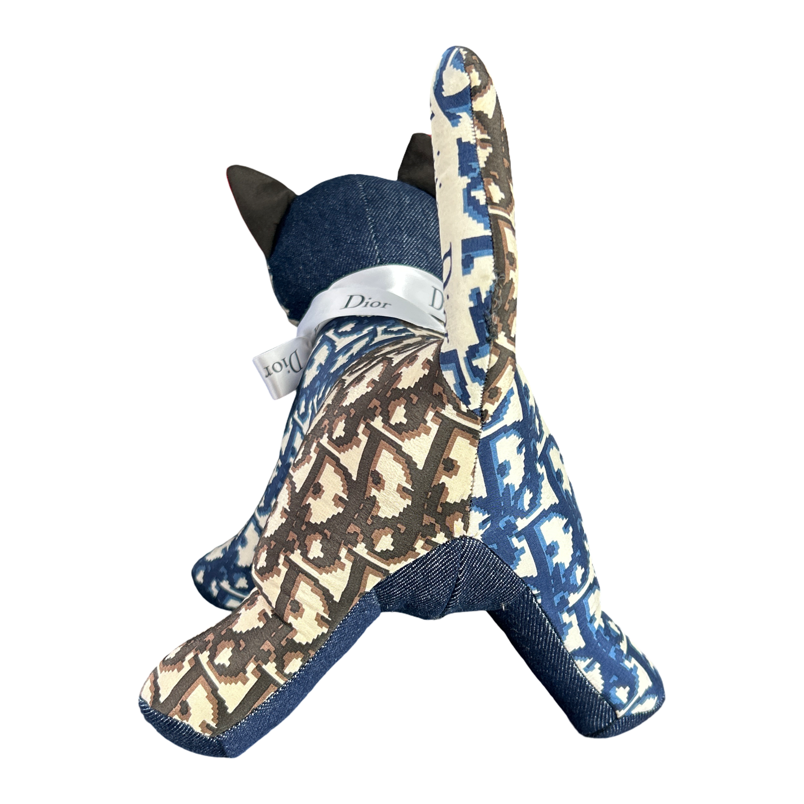 Vintage Dior Trotter silk scarves paired with blue denim cloth handmade into a one of a kind animal.  Non-Allergenic polyfill stuffing.  For decorative use only.