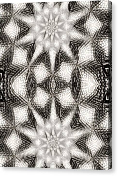 A mesmerizing pattern featuring complex, symmetrical geometric designs is showcased. The image possesses a monochromatic palette with various shades of black and white, creating a striking visual effect.