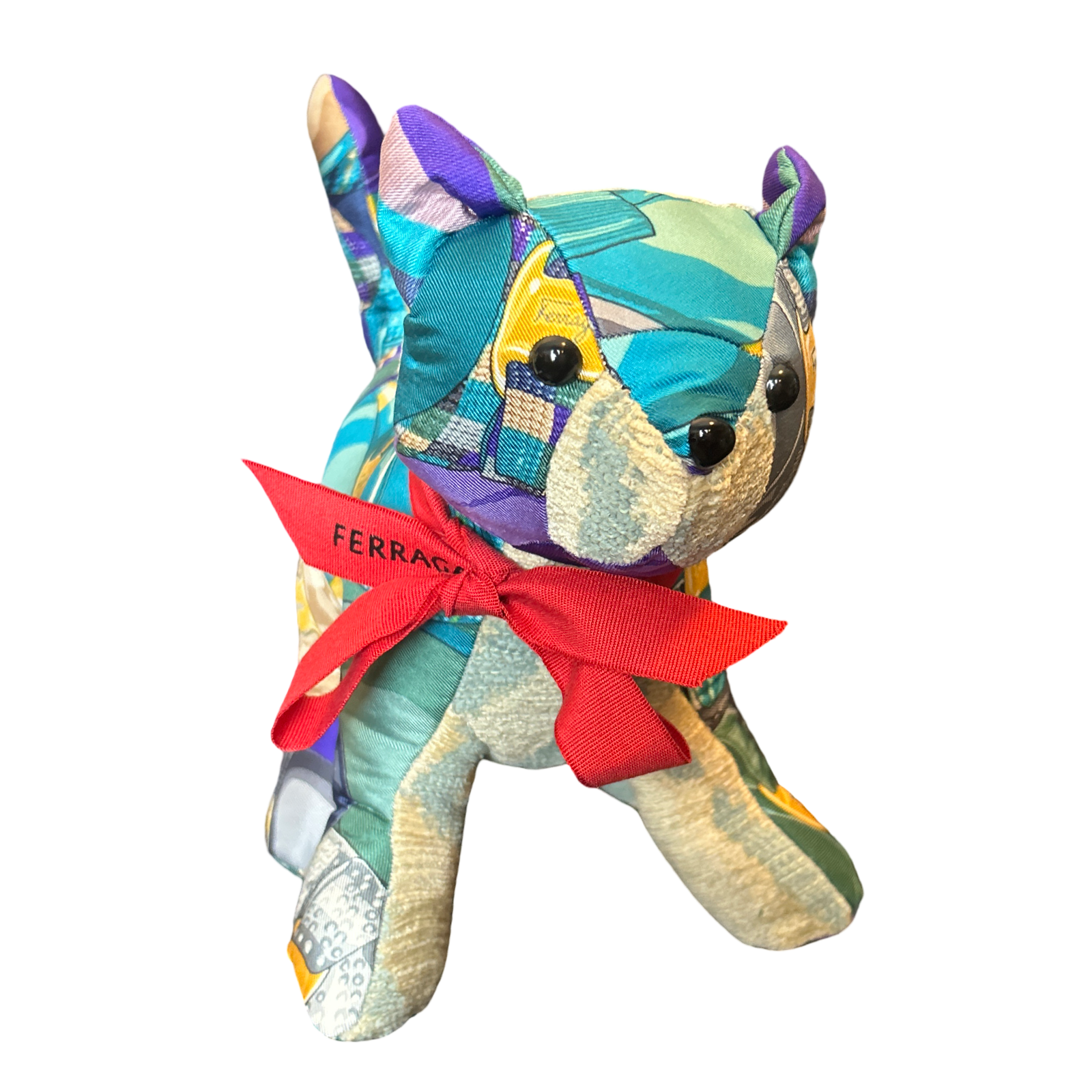 Vintage Ferragamo Varina silk scarf paired with velvet fabric handmade into a one of a kind animal.  Non-Allergenic polyfill stuffing.  For decorative use only.