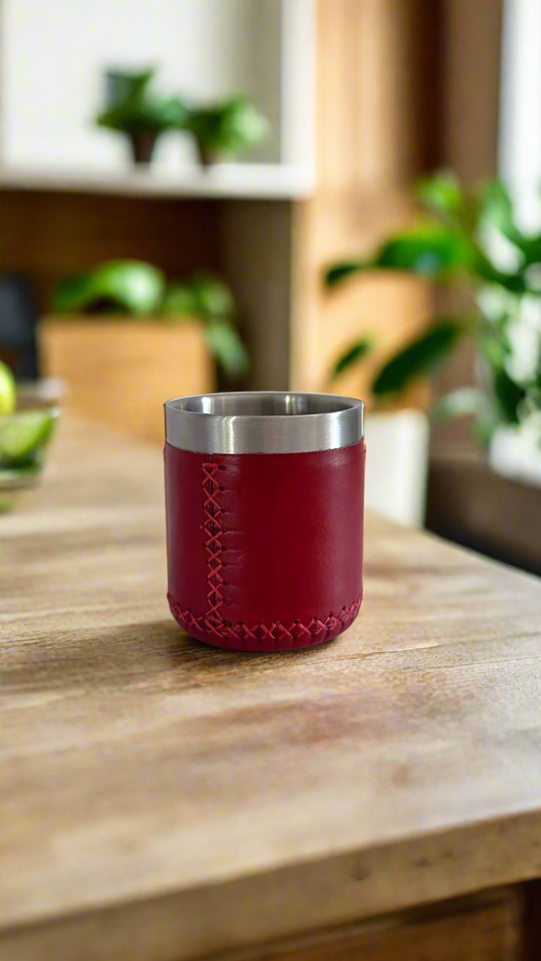 - Soft, natural Paraguayan cow leather is wrapped and hand-stitched onto shatter-proof cups