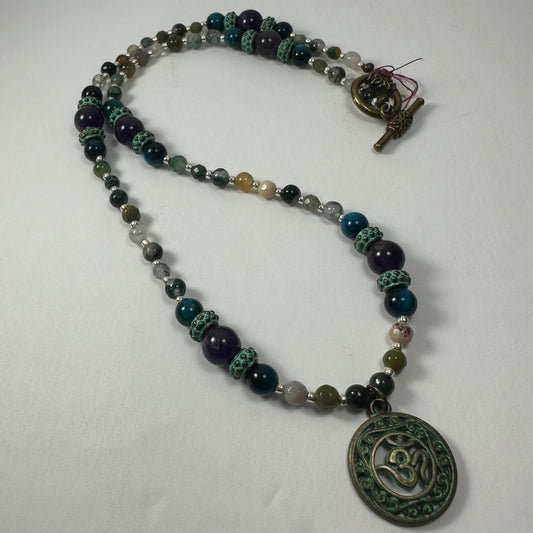 Bronze Patina 'Om' Pendant on Mixed Bead Necklace