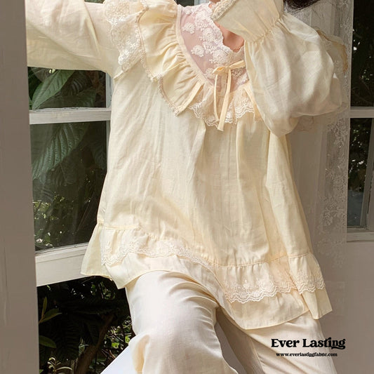 French Ruffled Long Sleeves and Pants Pajama Set / Navy