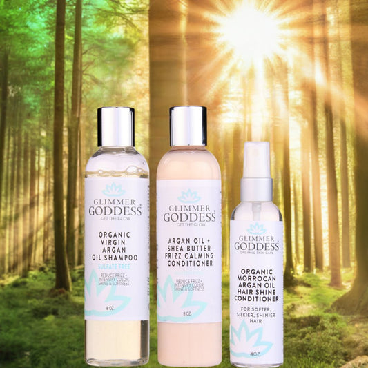 Organic Argan Oil Hair Treatment Trio, Hydrating Shampoo, Deep Conditioner, and Hair Shine Spray