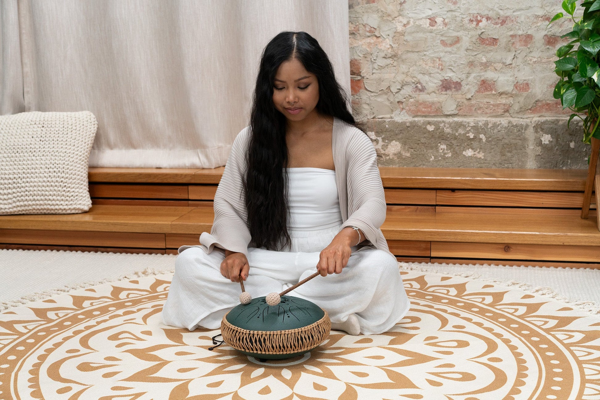 Experience the introspective and resonant tones of the Medium Octave Steel Tongue Drum, tuned to F# Minor for a deeply meditative and reflective sound journey.