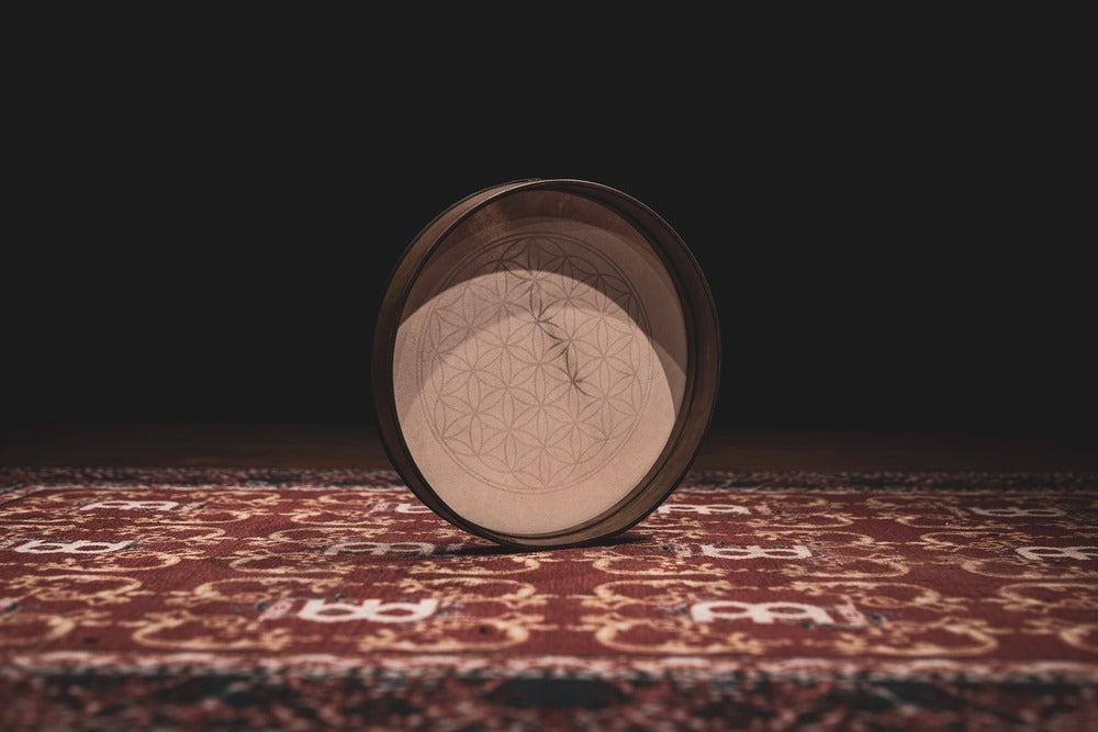 Experience deep, resonating tones with this 16" hand drum, featuring a hand-selected goat head that enhances warmth and tonal richness. The sacred Flower of Life symbol adds profound spiritual significance to this exceptional sound healing instrument.