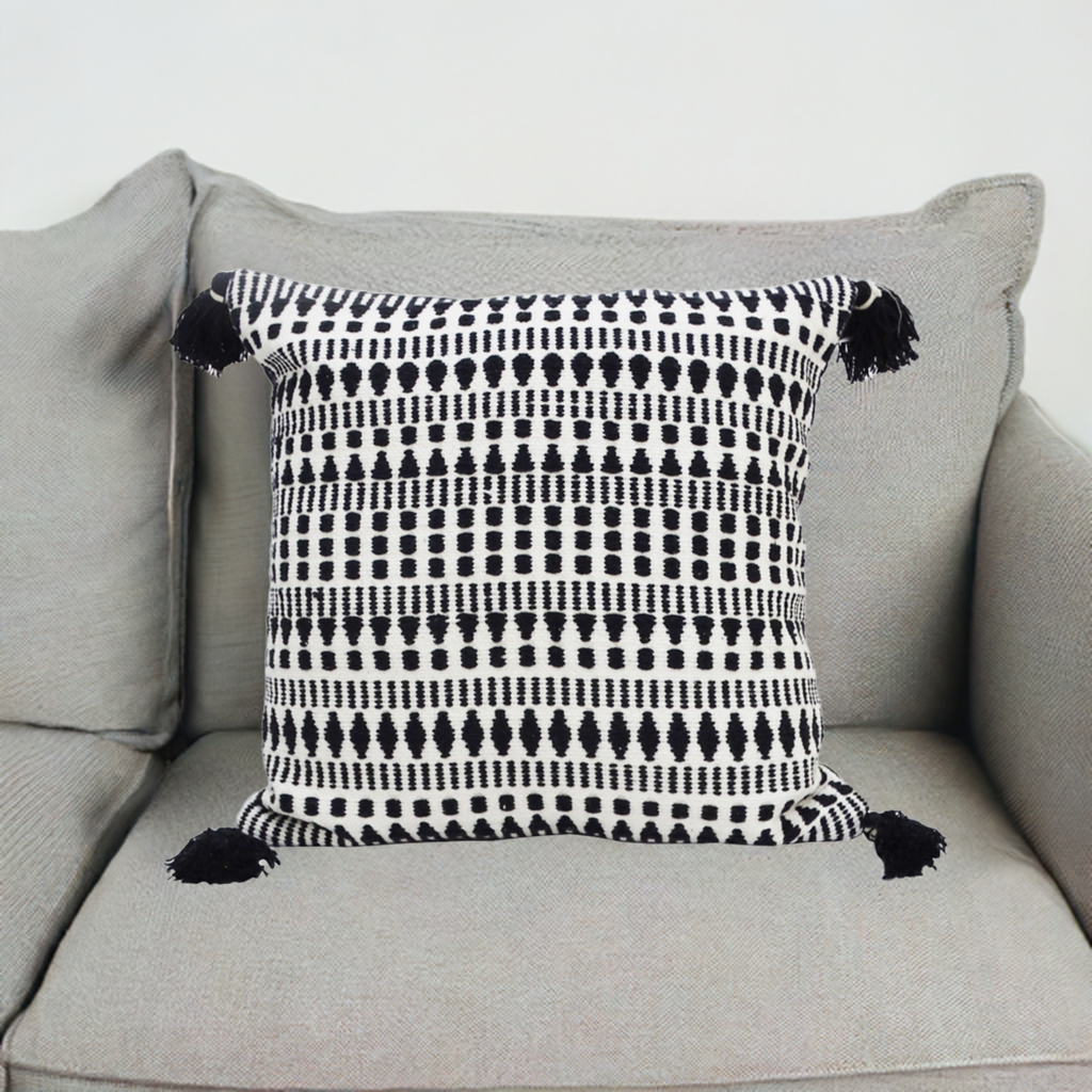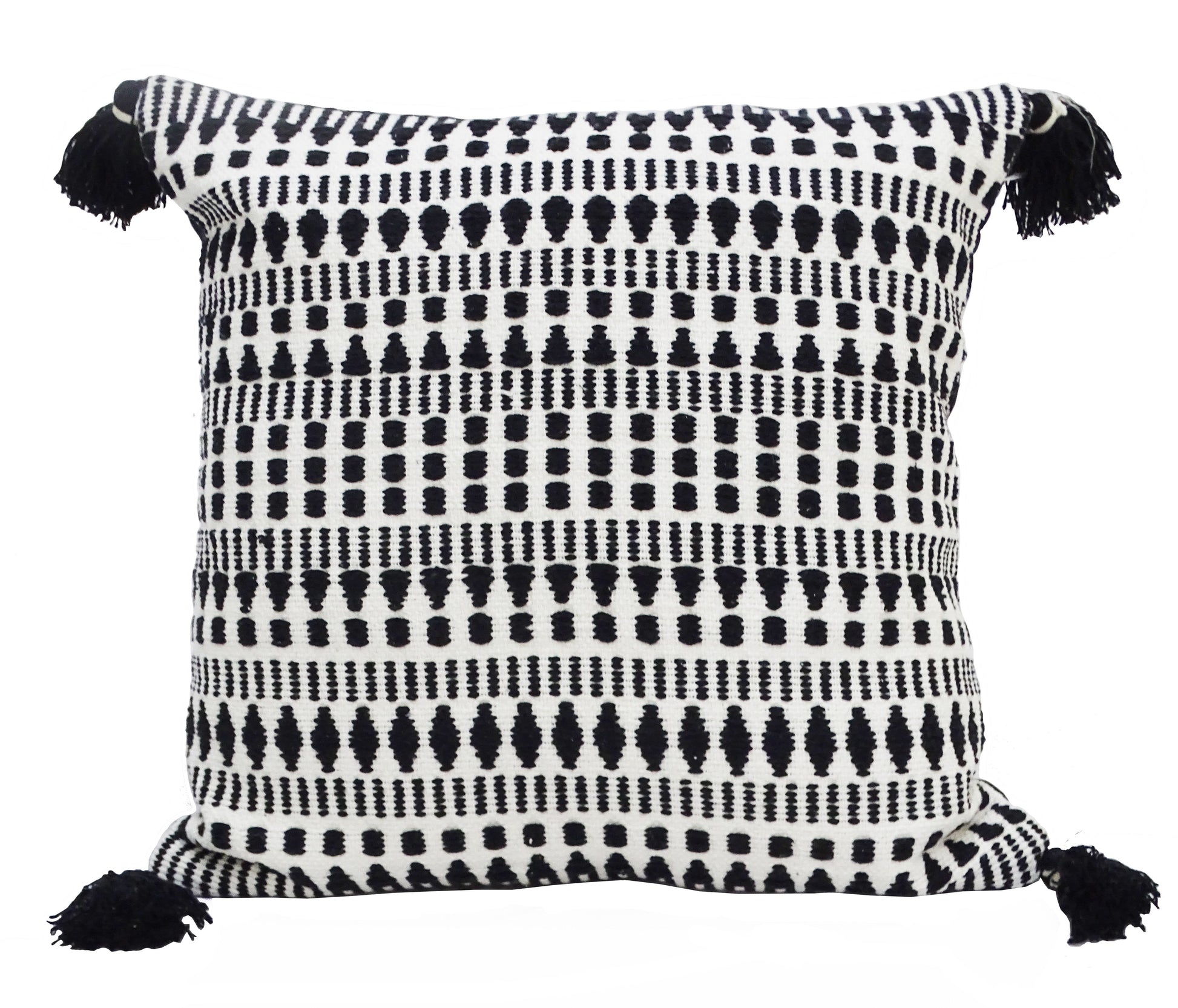 Vibhsa throw pillows make your home more welcoming and loving. Great decorative pillows for holiday seasons and good fit for modern and classic home decor styles. Hand woven or embroidered sofa pillow gives an elegant look to your furniture, and keep up cohesive contemporary looks to your home. Product dimension - 22" L x 22" W Includes - 1 Decorative pillow with high quality insert Accent pillow for couch with tassels Black and white woven throw pillow with tassels Added corner tassels Indoor use only Back of the pillow has solid color with no pattern Designed in USA Zipper closure for easy removal of insert 60 days limited manufacturing warranty on manufacturing defects Hand-woven Cotton Dobby Fabric Spot Clean